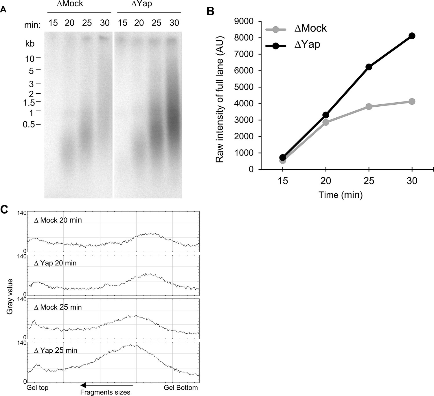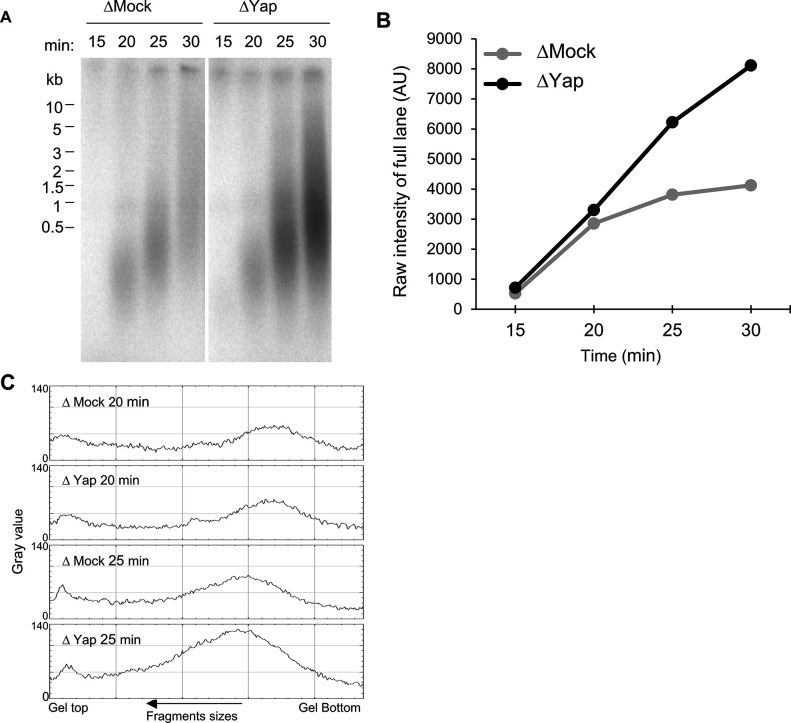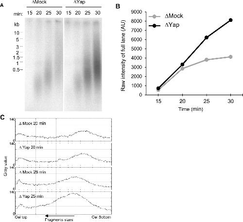 Figure 1-figure supplement 3. Yap depletion does not affect entry into S-phase. (A) Nascent DNA strands synthesized during early S-phase were analysed at the indicated times by alkaline gel electrophoresis, as described in Figure 1âfigure supplement 2A. (B) The amount of radioactivity incorporation was quantified for each lane and plotted as raw intensity values. Very similar incorporation is observed at the earliest time points (15â20 min) before getting higher in Yap-depleted (ÎYap) compared to control-depleted extracts (ÎMock) (25â30 min). (C) Grey scale profile (ImageJ) of lanes at 20 and 25 min, showing that size distribution of nascent strands is nearly identical in both conditions, and therefore entry in S-phase is unchanged after Yap depletion. |