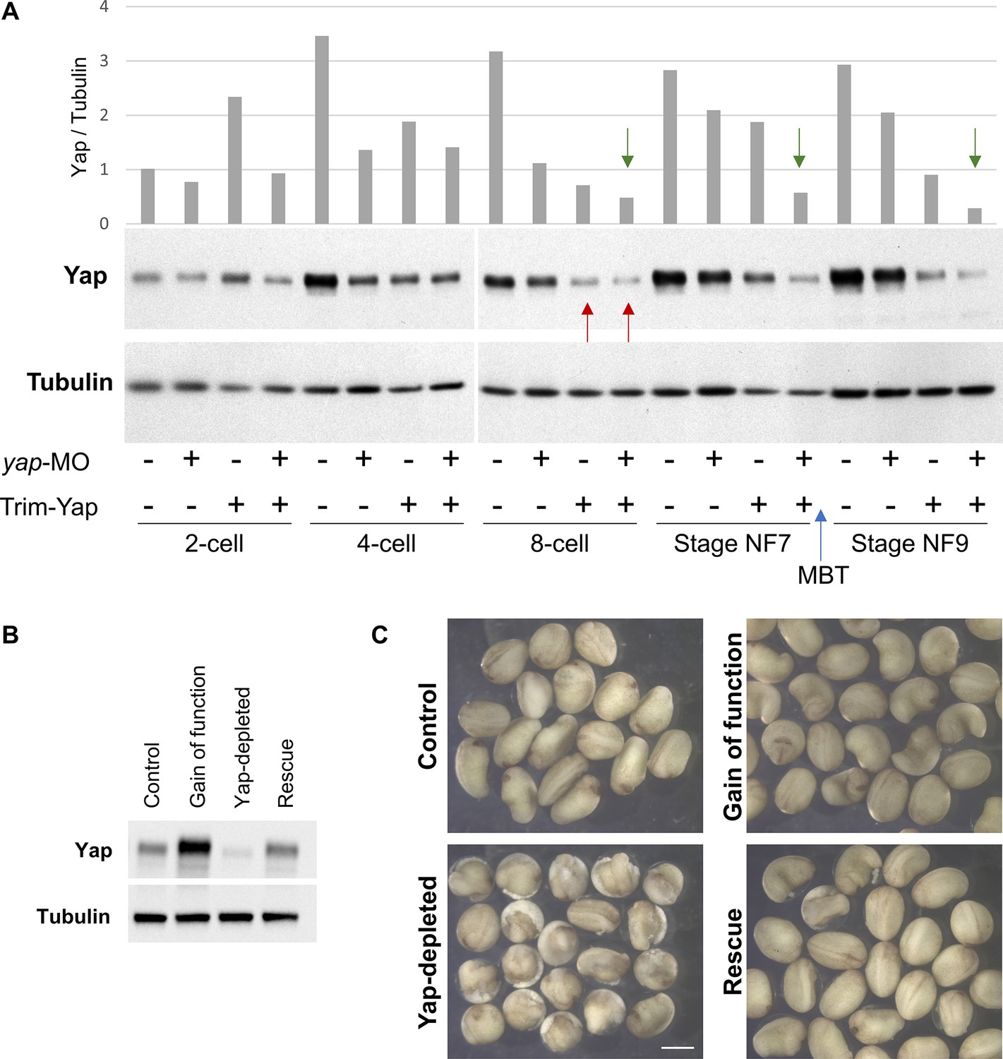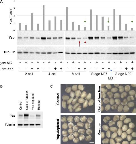 Figure 5âfigure supplement 1. Yap knockdown using the Trim-Away strategy is effective at very early stages of development. (A) Western blot performed on whole protein extracts from a pool of 8 embryos injected with either control morpholinos (-) or yap morpholinos (yap-MO, +), and/or pre-immune serum +TRIM21 (-) or anti-Yap antibodies + TRIM21 (Trim-Yap, +). Embryos were injected at the one-cell stage, then harvested at different times during development as indicated. The mid-blastula transition (MBT, blue arrow) as well as the time at which Yap depletion becomes observable (red arrows) are indicated. Green arrows indicate that Trim-Away and morpholino combined are more effective. Ratios of optical densities (OD) from Yap bands normalized to OD of tubulin bands are shown on the top panel. (B, C) Embryos injected as in Figure 5C were allowed to develop until the neurula stage. The levels of Yap protein at this stage were monitored by western blot (B). Pictures of the resulting embryos are shown for each condition (C). Scale bar = 1 mm. |
