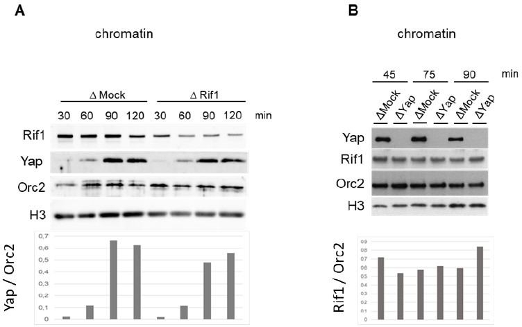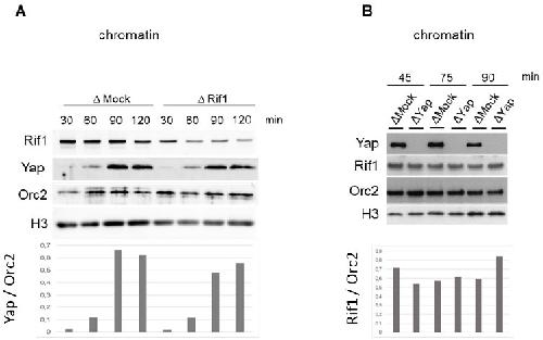Author response image 1. Rif1 depletion (A) or Yap depletion (B) does not inhibit Yap or Rif1 recruitment, respectively, onto chromatin in egg extracts. |