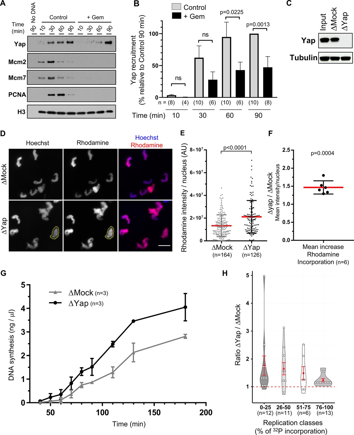 Figure 1. Yap is recruited to chromatin during DNA replication and the absence of Yap accelerates DNA synthesis in Xenopus egg extracts. (A) Sperm nuclei were incubated in Xenopus egg extracts in the absence (Control) or presence of geminin (+Gem). Chromatin was isolated for immunoblotting at indicated times points before and during DNA replication. (B) Quantification of chromatin-bound Yap: percentage of optical densities of the Yap bands relative to that in the control condition at 90 min in isolated chromatin fractions. The number, n, of analysed fractions per time point during DNA replication is indicated for each bar. Statistical differences according to Mann-Whitney test (p-values indicated; ns, not significant). Data is reported as mean ± SEM. (C) Western blot showing the efficiency of Yap protein depletion in Xenopus egg extracts. Extracts were immunodepleted with either a rabbit anti-Yap antibody (ÎYap) or a rabbit IgG as a control (ÎMock). Tubulin was used as a loading control. (D) Mock- or Yap-depleted extracts were supplemented with sperm nuclei and incubated with rhodamine-dUTP for 60 min. Sperm nuclei were localized by Hoechst fluorescence to define regions of interest (as exemplified for one nucleus with yellow dotted circle). Scale bar = 20 μm. (E) Rhodamine-dUTP incorporation was quantified as fluorescence intensity per nucleus (arbitrary units (AU); scatter blot with mean and SD; Mann-Whitney Test, two-tailed; p-value indicated). (F) Mean increase of fluorescence per nucleus after Yap depletion versus Mock depletion from six independent experiments (scatter blot with mean with SD; one sample t-test, two-tailed, p-value indicated). (G) Mock- or Yap-depleted extracts were supplemented with sperm nuclei and [α32P]dCTP for different times, DNA was purified, counted for [32P] incorporation and absolute DNA synthesis was calculated as ng of synthetized DNA per µg of total DNA. Means ± SEM from three independent experiments are shown. (H) Violin plot showing ÎYap/ÎMock ratio of incorporation from eight independent nascent DNA strands experiments. The percentage of incorporation was fractionated in four intervals to distinguish early (0â25%), mid (25â50%), late (51â75%), and very late (76â100%) phases of the replication process. The red dashed line highlights a ÎYap/ÎMock ratio of 1 that indicates no difference in the level of DNA synthesis between the two conditions, with the red dot indicating the mean and the red error bar the SEM; Wilcoxon signed ranked test, p-values: p=0.002 (0â25%, n=12), p=0.014 (26â50%, n=11), p=0.16 (51â75%, n=6), p=0.0002 (76â100%, n=13). |