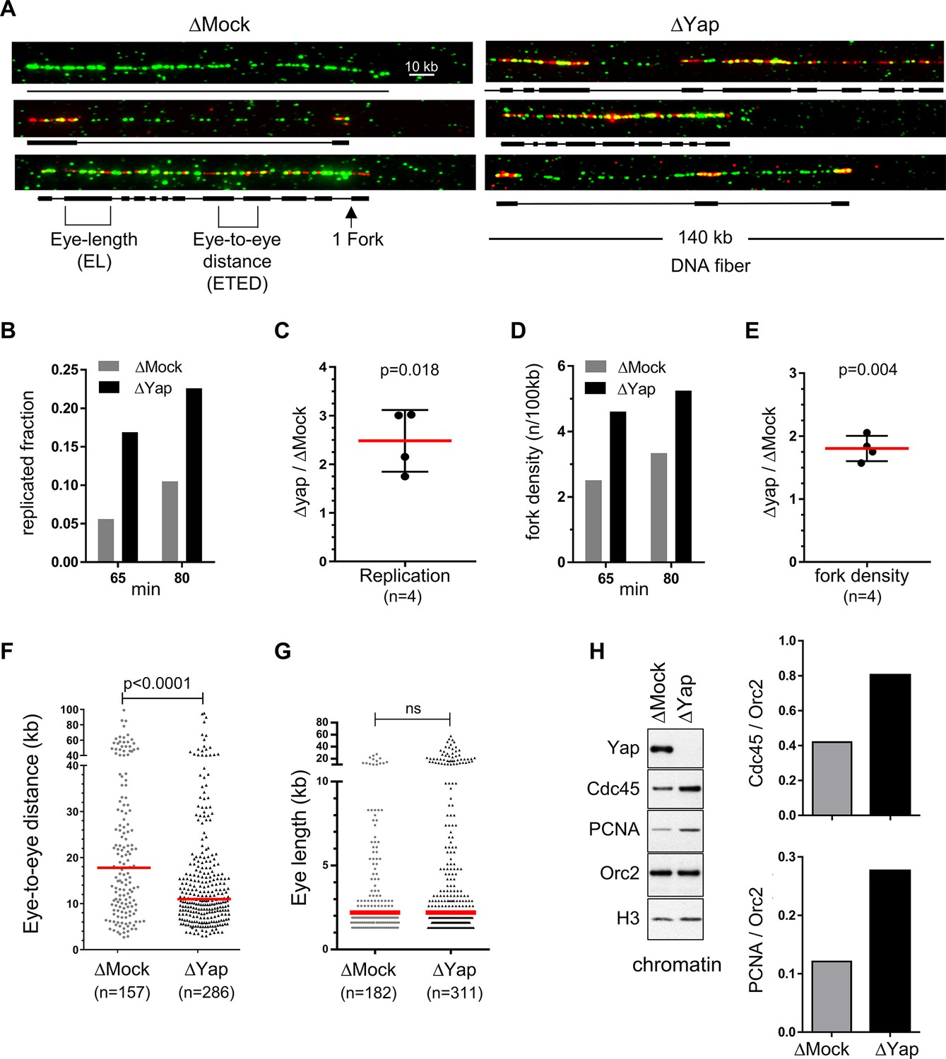 Figure 2. Egg extracts lacking Yap exhibit more active replication origins. Sperm nuclei were incubated in egg extracts in the presence of biotin-dUTP and DNA combing was performed. (A) Three representative combed DNA fibers from one combing experiment (replicate 1) after 55 min biotin-dUTP incubation in either Mock- or Yap-depleted extracts (green: whole DNA labelling; red: biotin labelled replication eyes). (B) Replicated fraction of one combing experiment (replicate 2) at two time points (min). (C) Scatter plots of ÎYap/ÎMock ratios of replicated fractions of both combing experiments at 2 time points, with mean and standard deviation, p value from one-sample t-test compared to theoretical mean 1. (D) Fork density (number of forks/100 kb) of one combing experiment (replicate 2) at two time points (min). (E) Scatter plots of ÎYap/ÎMock ratios of fork densities of both combing experiments at 2 time points, with mean and standard deviation, p value from one-sample t-test compared to theoretical mean 1. (F) Eye-to-eye distance (ETED) distributions of one combing experiment (replicate 2) at 80 min after Mock- or Yap-depletion, scatter dot plots with median (red bar), Mann-Whitney test. (G) The eye length (EL) distributions of one combing experiment (replicate 2) at 65 min after Mock- or Yap- depletion, scatter dot plots with median (red bar), Mann-Whitney test; ns, non-significant. (H) Left panel: western blot of chromatin bound proteins after Mock- or Yap-depletion at early S-phase with indicated antibodies. Right panel: quantification of Cdc45/Orc2 and PCNA/Orc2 ratios. |