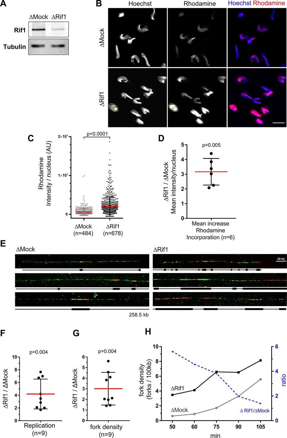 Figure 4. Rif1 depletion increases global fork density in egg extracts. (A) Western blot of egg extracts after Mock- or Rif1-depletion using the indicated antibodies. Tubulin is used as a loading control. (B) Mock- or Rif1-depleted extracts were incubated with sperm nuclei and rhodamine-dUTP. Replicating sperm nuclei were localized by Hoechst fluorescence (as exemplified for one nucleus with yellow dotted circle). Scale bar = 20 μm. (C) Rhodamine-dUTP incorporation was quantified as fluorescence intensity per nucleus (AU for arbitrary units), scatter plot with Mean ± SD (Mann-Whitney test, two-tailed, p-value indicated). (D) Mean increase of fluorescence/nucleus after Yap-depletion versus Mock-depletion from six independent experiments, scatter plot with mean ± SD, one-sample t-test (two tailed), p-value indicated. (E) Sperm nuclei were incubated in egg extracts in the presence of biotin-dUTP and DNA combing was performed. Three representative combed DNA fibers replicated in either the Mock- or Rif1-depleted extracts from one combing experiment (replicate 1) at 75 min (green: whole DNA labelling; red: biotin-labelled replication eyes). (F, G) Replicated fractions (F) and fork density (number of forks/100 kb) (G) from two independent experiments at several time periods of biotin-dUTP incorporation, Scatter plots of ÎRif1/ÎMock ratios with mean and standard deviation, p values from one-sample t-test compared to theoretical mean 1. (H) Fork density and fork density ratios of one combing experiment (replicate 1) at different time points (min). |