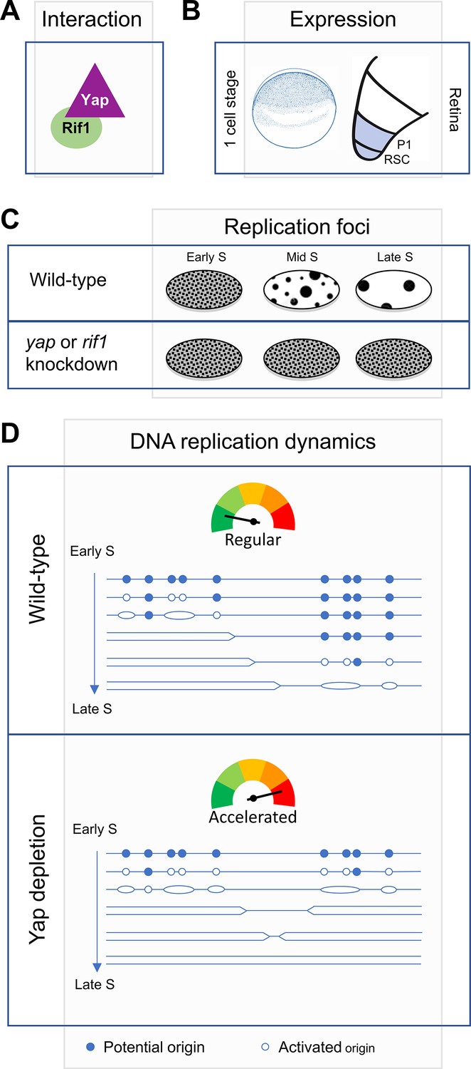 Figure 8. Diagram illustrating Yap function in the control of DNA replication dynamics. We found that Yap and Rif1 can interact (A) and are co-expressed in Xenopus early embryos as well as in retinal stem (RSC)/progenitor cells (P1) (B). (C) We found that yap and rif1 knockdowns in retinal stem/progenitor cells similarly alter the proper repartition of early and late-like patterns of replication foci (this study and Cabochette et al., 2015). (D) We propose a model where Yap and Rif1 would ensure the proper orchestration of the RT program during early development. The schematic representation of the replication program was adapted from Gaboriaud J and Wu PJ (Gaboriaud and Wu, 2019). Based on our assays in vitro in egg extracts and in vivo in early embryos, we propose that following Yap depletion (bottom panel), the number of firing origins is increased, and S-phase length is reduced compared to a wild-type situation (top panel). |