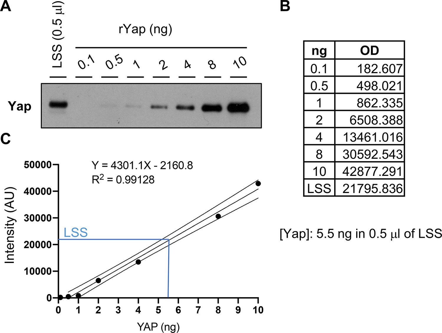 Figure 1âfigure supplement 1. Yap protein concentration in Xenopus egg extracts. (A) Western blot showing different amounts of recombinant Yap (rYap) used to estimate endogenous Yap in egg extracts (LSS for low-speed supernatant). (B, C) The optical densities (OD) of the protein bands from (A) were used to plot a standard curve and to calculate Yap amount in the LSS. |
