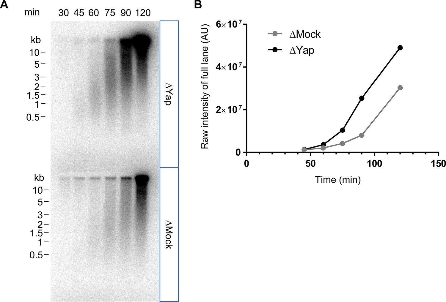 Figure 1âfigure supplement 2. Yap depletion increases nascent strand synthesis in egg extracts. (A) Immunodepleted extracts with either a rabbit anti-Yap antibody (ÎYap) or a rabbit IgG as a control (ÎMock) were supplemented with sperm nuclei and incubated with [α32P]dCTP for the indicated times in order to label nascent DNA increasing in length during replication. Nascent DNA strands synthesized were analysed using alkaline gel electrophoresis. (B) The level of radioactivity incorporation was quantified for each lane and plotted as raw intensity values (arbitrary units (AU)). |