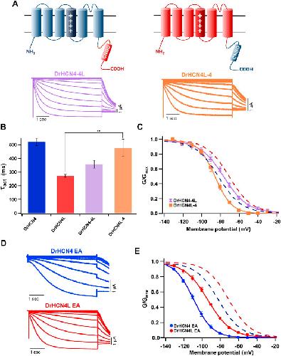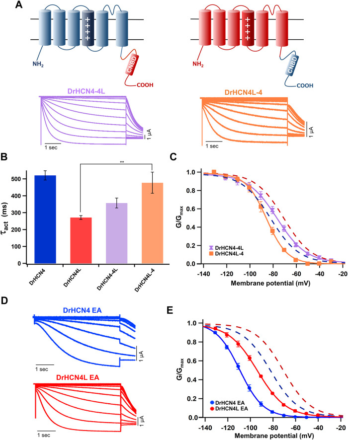 act) at −130 mV of DrHCN4 (blue), DrHCN4L (red), DrHCN4-4L (purple) and DrHCN4L-4 (orange). The currents were fitted with a single exponential. (C) Activation curves of the zebrafish chimeric HCN4 channels (n = 5). The Boltzmann function was used to fit the curves. Blue and red dashed curves are the activation curves of DrHCN4 and DrHCN4L from Figure 1C. (D) Representative current traces of the EA mutants, DrHCN4 EA and DrHCN4L EA. (E) Activation curves of the EA mutant channels (n = 5). The Boltzmann function was used to fit the curves. Blue and red dashed curves are the activation curves of DrHCN4 and DrHCN4L from Figure 1C.