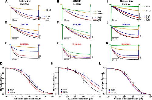 FIGURE 4. Sensitivities of DrHCN4 and DrHCN4L to HCN inhibitors. (A–C) Representative current traces sequentially applied with 0–100 µM of ivabradine. The holding potential was −30 mV and was hyperpolarized to −120 mV for 2 s. (D) Ivabradine inhibition curves based on currents of (A–C). DrHCN4 (blue; n = 5), DrHCN4L (red; n = 4) and HsHCN4 (black; n = 4). (E–G) Representative current traces sequentially applied with 0 μM–1 mM of ZD7288. The holding potential was −30 mV and was hyperpolarized to −120 mV for 2 s. (H) ZD7288 inhibition curves based on currents of (E–G). DrHCN4 (blue; n = 5), DrHCN4L (red; n = 5) and HsHCN4 (black; n = 5). (I–K) Representative currents sequentially applied with 0 μM–1 mM of cesium ion. The holding potential was −30 mV and was hyperpolarized to −120 mV for 2 s. (L) Cesium ion inhibition curves based on currents of (I–K). DrHCN4 (blue; n = 5), DrHCN4L (red; n = 5) and HsHCN4 (black; n = 5).