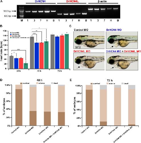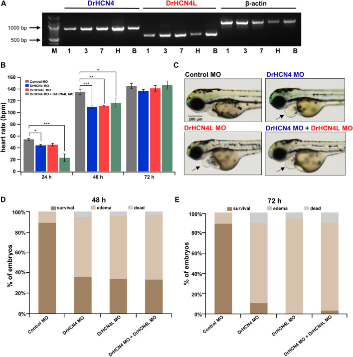 FIGURE 6. Effects of HCN4 channel knockdown on zebrafish. (A) Expression of DrHCN4 and DrHCN4L in one (1), three (3), and seven (7) day embryos/larvae as well as in the heart (H) and brain (B) of adult fish was confirmed by RT-PCR. Arrows indicate the DNA ladder markers of 1,000 bp and 500 bp. (B) Heart rates at 24, 48, and 72 h are shown in bar graphs for 200 μM MO-injected zebrafish embryos: control MO (n = 20), DrHCN4 MO (n = 10), DrHCN4L MO (n = 10), and mixed DrHCN4 and DrHCN4L MO (n = 10). Statistical analysis was performed by Dunnett’s test. (C) Representative examples of zebrafish injected with control MO, DrHCN4 MO, DrHCN4L MO, and mixed DrHCN4 and DrHCN4L MO. Zebrafish with DrHCN4 MO, DrHCN4L MO, and mixed DrHCN4 and DrHCN4L MO showed pericardial edema (black arrows). Bar, 200 μm. (D) Ratios of normal embryos, pericardial edema, and death at 48 h after injection of 200 µM MO: control MO (n = 136), DrHCN4 MO (n = 75), DrHCN4L MO (n = 34), and mixed DrHCN4 and DrHCN4L MO (n = 30). (E) Pericardial edema and death ratios at 72 h after injection of 200 µM MO. Control MO (n = 136), DrHCN4 MO (n = 75), DrHCN4L MO (n = 34), and mixed DrHCN4 and DrHCN4L MO (n = 30).