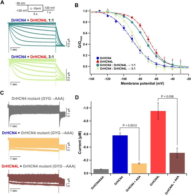 FIGURE 3. DrHCN4 and DrHCN4L can form a heterotetrametric channel. (A) Representative current traces of a mixture of DrHCN4 and DrHCN4L mRNA. The mixed mRNA concentrations were 1:1 (green) and 3:1 (light green). Membrane potential was varied from −30 mV to −130 mV in 10-mV decrements and held for 5 s at each potential. The inset shows the stimulation protocol. (B) Activation curves of the mixed channels of DrHCN4 and DrHCN4L. The mixed mRNA concentrations were 1:1 (green) and 3:1 (light green). Blue and red curves are the activation curves of DrHCN4 and DrHCN4L, respectively. The Boltzmann function fits the activation curves (n = 5). All data are from the same batch of oocytes. Therefore, the data sets of DrHCN4 and DrHCN4L are different from the datasets used in Figures 1, 2. (C) Representative current traces of a dominant-negative mutant with or without wild-type DrHCN4 or DrHCN4L. From top to bottom: DrHCN4 mutant (DrHCN4AAA) only, DrHCN4 (wild-type) + DrHCN4AAA, DrHCN4L (wild-type) + DrHCN4AAA. Wild-type and mutant cRNAs were mixed in a 1:1 ratio with 5 ng each. (D) Averaged current amplitudes at −100 mV were plotted as bar graphs [n = 5 for each except DrHCN4AAA alone (n = 4)].