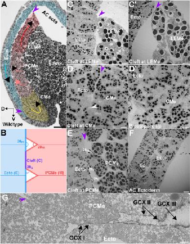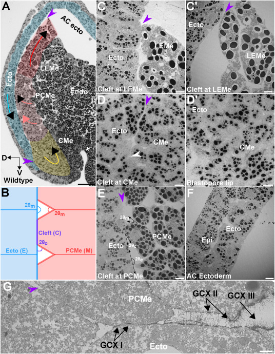 Fig. 1. Distinct regions of Brachet's cleft in the Xenopus laevis gastrula. (A) Semi-thin section of stage 11 Xenopus laevis gastrula highlighting dorsal tissues: Ectoderm (Ecto; blue), Animal cap ectoderm (AC ecto), chordamesoderm (CMe; yellow), prechordal mesoderm (PCMe; pink), leading-edge mesendoderm (LEMe; red), and endoderm (Endo; blue). Colored arrows denote movement of corresponding tissues during gastrulation. Black arrows: D, dorsal; V, vegetal. Brachet's cleft is indicated by purple arrowheads. (B) Illustration of Brachet's cleft depicting contact angles between adjacent cells along the boundary surface of the ectoderm (2θe), PCMe (2θm), and between ectoderm and PCMe (2θc). Contact angles also indicated in panel E. (C–G) TEM images of dorsal tissues. (C,C′) Anterior cleft at leading-edge mesendoderm. (D) Posterior cleft at chordamesoderm. White arrowhead indicates end of cleft. (D′) Vegetal region below posterior cleft where chordamesoderm and ectoderm are indistinguishable. (E) Middle cleft region at prechordal mesoderm. (F) Anterior animal cap ectoderm. Epithelium (Epi). (G) Lanthanum-stained contacts between prechordal mesoderm and ectoderm cells. Glycocalyx type I, II or III (GCX I/II/III; Barua et al., 2021). Scalebars: black = 100 μm, white = 10 μm in C–F, 1 μm in G.