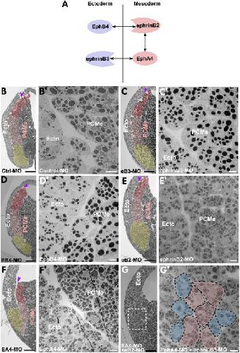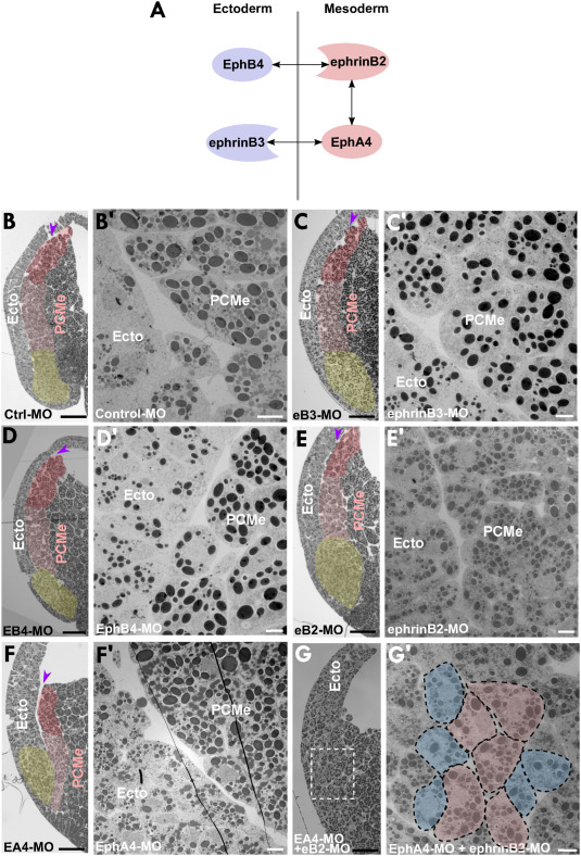 Fig. 4. Eph/ephrin knockdown in the Xenopus gastrula. (A) Illustration of anti-parallel ephrin forward signaling at Brachet's cleft (Rohani et al., 2011). (B,C,D,E,F,G) Semi-thin sections of wildtype and Eph/ephrin morphant Xenopus gastrulae viewed using brightfield microscopy. (B′,C′,D′,E′,F′,G′) TEM images of wildtype and Eph/ephrin morphants. (F′) TEM image of a boxed region in panel G. Colored cells correspond with prechordal mesoderm (pink) and ectoderm (blue). Scalebars: black = 100 μm, white = 10 μm.
