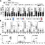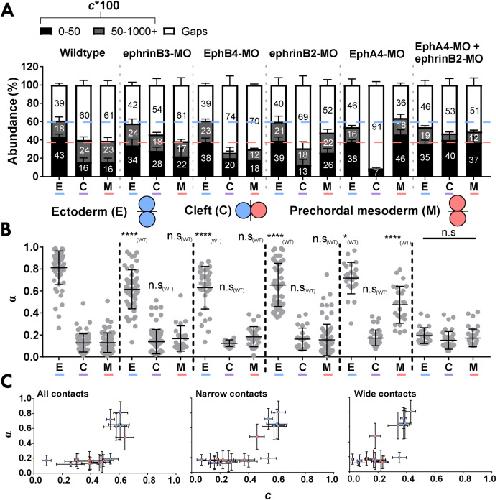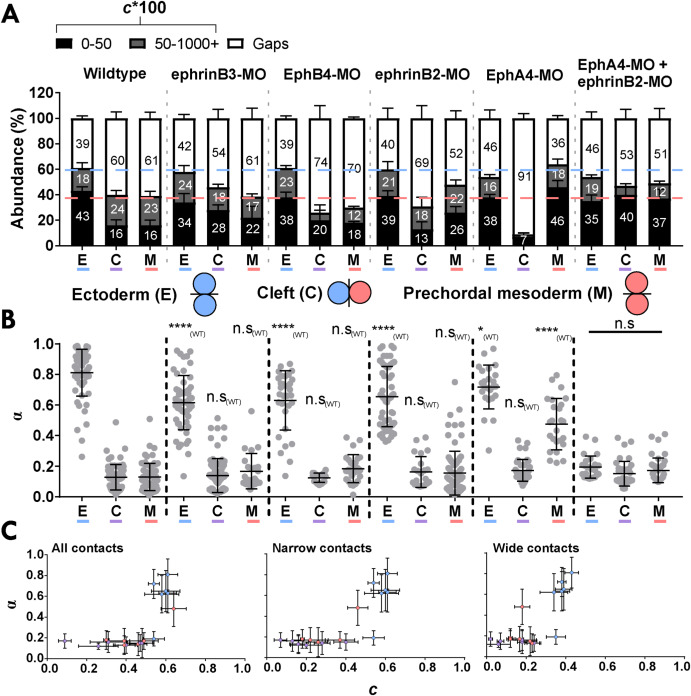 Fig. 5. Eph/ephrin modulation of adhesiveness in the Xenopus gastrula. (A) Mean abundance of contacts and gaps in Eph/ephrin morphant tissues: ectoderm (blue), prechordal mesoderm (pink), and between ectoderm and mesoderm at Brachet's cleft (purple). (B) Relative adhesiveness α of morphant tissues. (C) Correlation between contact abundance c and α. Contact abundance c was derived as the fraction of total contact abundance divided by 100, e.g.: c = 0.61 for wildtype ectoderm. Error bars represent standard deviation of the mean. One-way ANOVA was used to analyze variance. p > 0.05 = n.s, p < 0.01 = ∗∗, p < 0.001 = ∗∗∗, p < 0.0001 = ∗∗∗∗. Wildtype: n = 24 embryos; EphB4-MO: n = 12, ephrinB2-MO: n = 16; EphA4-MO: n = 16; ephrinB3-MO: n = 16, and; EphA4-MO + ephrinB2-MO: n = 12.