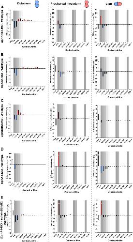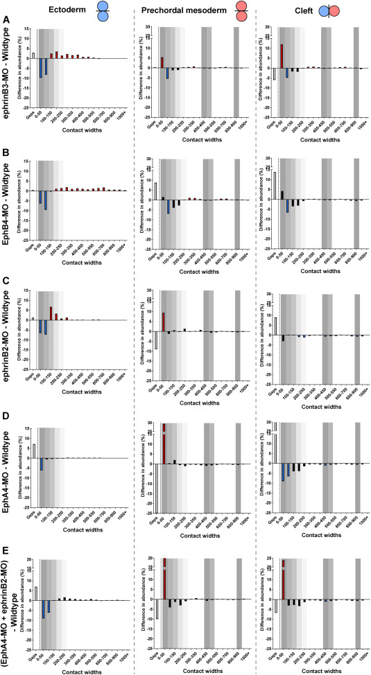 Fig. 7. Eph/ephrin signaling controls cell contact patterning. Contact difference spectra for (A) ephrinB3 morphants, (B) EphB4 morphants, (C) ephrinB2 morphants, (D) EphA4 morphants, (E) EphA4 and ephrinB2. The left-most column (white) in each plot denotes interstitial gaps. Blue and red colored columns indicate decreases or increases (respectively) in contact abundance, which are statistically significant (p < 0.05) and represent ≥50% changes in morphants compared with wildtype. Gray-shaded regions highlight recurrent peaks.