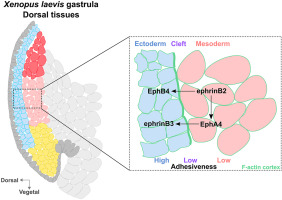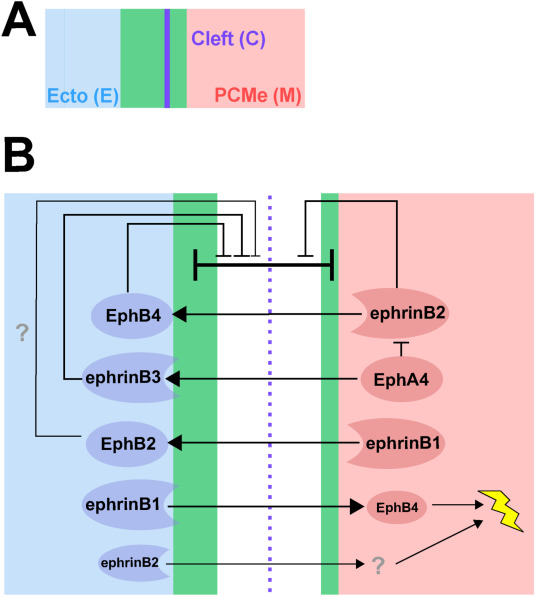 Fig. 8. Eph/ephrin parallel forward and reverse signaling controls contact-induced F-actin cortex downregulation. (A) Basic diagram of cell contacts at Brachet's cleft. (B) Model of Eph/ephrin signaling mechanism and its effects on F-actin cortex downregulation upon contact between ectoderm and mesoderm cells at the cleft corresponding with the boxed region of panel A. The F-actin cortex is indicated in green, ectoderm in blue, and mesoderm in pink. Smaller bubbles containing ephrinB2 (ectoderm), and EphB4 (mesoderm) indicate lower reported expression within the respective tissue (Fagotto et al., 2014). Eph-ephrin interactions with unknown effects on contact-induced cortex downregulation are indicated by smaller arrows, thinner inhibitory lines, and question marks. Yellow lightning bolt indicates cell repulsion event.