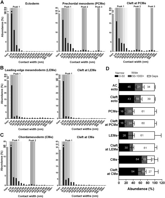 Fig. 2. Patterning of cell-cell contacts in dorsal tissues and at Brachet's cleft. (A–C) Contact spectra of dorsal gastrula tissues and different regions of Brachet's cleft. The abundance of contact types determined by 50 nm widths bins is shown. Gray shaded regions highlight characteristic recurrent peaks in contact abundance. (D) Mean relative abundance of narrow (<50 nm) and wide (>50 nm) contacts, and gaps. Error bars represent standard deviation of the mean. n = 24 embryos for all tissues.