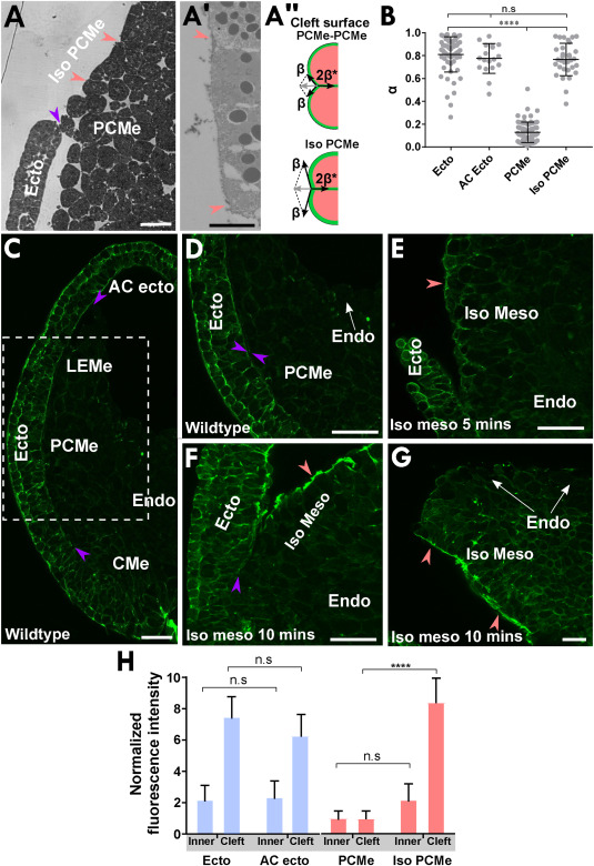 Fig. 3. F-actin in the dorsal tissues of the Xenopus gastrula. (A) Semi-thin section of isolated prechordal mesoderm (PCMe) viewed using brightfield microscopy. Point of contact between remaining ectoderm and PCMe is indicated by a purple arrowhead. (A′) TEM image of the surface of isolated PCMe. Pink arrowheads indicate the surface of isolated PCMe. (A”) Diagram of tensions in relation to contact angles between PCMe cells along the cleft surface. (B) Relative adhesiveness α for mesoderm-adjacent ectoderm (Ecto), animal cap ectoderm (AC Ecto), PCMe, and isolated PCMe (Iso PCMe). (C–G) Phalloidin stained sections of the dorsal tissues in the Xenopus stage 11 gastrula. Purple arrowheads indicate Brachet's cleft in panels C–G. (D) Magnified and slightly rotated view of boxed region in panel C. (E–G) Mesoderm 5 and 10 min after isolation. (H) Fluorescence intensity of cortical actin in wildtype and isolated boundary tissues at the cleft (cleft), and within the tissues (inner). All values are normalized to wildtype internal mesoderm values. Error bars represent standard deviation of the mean. One-way ANOVA was used to analyze variance. p > 0.05 = n.s, p < 0.0001 = ∗∗∗∗. Scalebars: black = 10 μm, white = 100 μm.