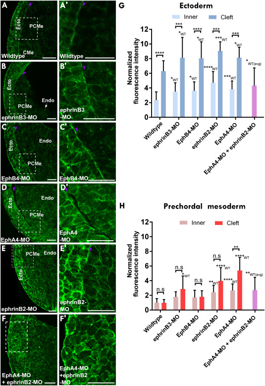 Fig. 6. F-actin in the dorsal tissues of the Xenopus gastrula. (A-F′) Phalloidin stained sections of dorsal tissues in wildtype and Eph/ephrin morphants. (A′,B′,C′,D′,E′,F′) Magnified view of boxed regions in corresponding panels A,B,C,D,E,F. Purple arrowheads indicate Brachet's cleft. (G,H) Fluorescence intensity of cortical actin at the cleft (cleft), and within the tissues (inner) in Eph/ephrin morphant ectoderm and prechordal mesoderm. Purple columns denote average fluorescence intensity within ectoderm and prechordal mesoderm in the absence of a cleft in EphA4-MO + ephrinB2-MO double morphants. All values are normalized to wildtype internal mesoderm values. Error bars represent standard deviation of the mean. One-way ANOVA was used to analyze variance between each treatment and wildtype and between inner and cleft measurements for each treatment. p > 0.05 = n.s, p < 0.05 = ∗, p < 0.01 = ∗∗, p < 0.001 = ∗∗∗, p < 0.0001 = ∗∗∗∗. Scalebars: white = 100 μm.