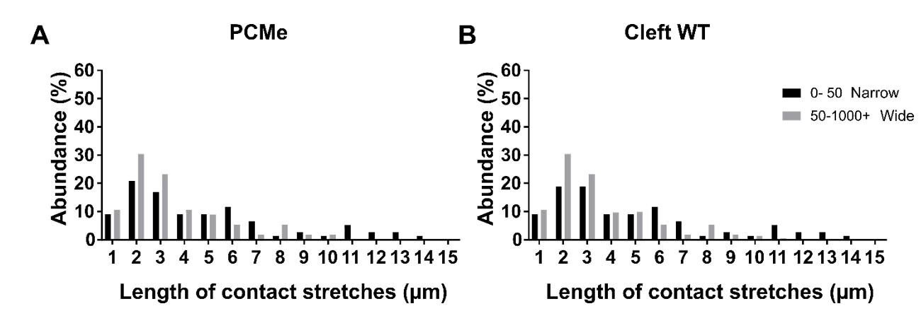 Figure S1. Distribution of the lengths of contact stretches. (A) Contact lengths between cells within the prechordal mesoderm and (B) between cells at the cleft between ectoderm and prechordal mesoderm. n = 24 embryos.