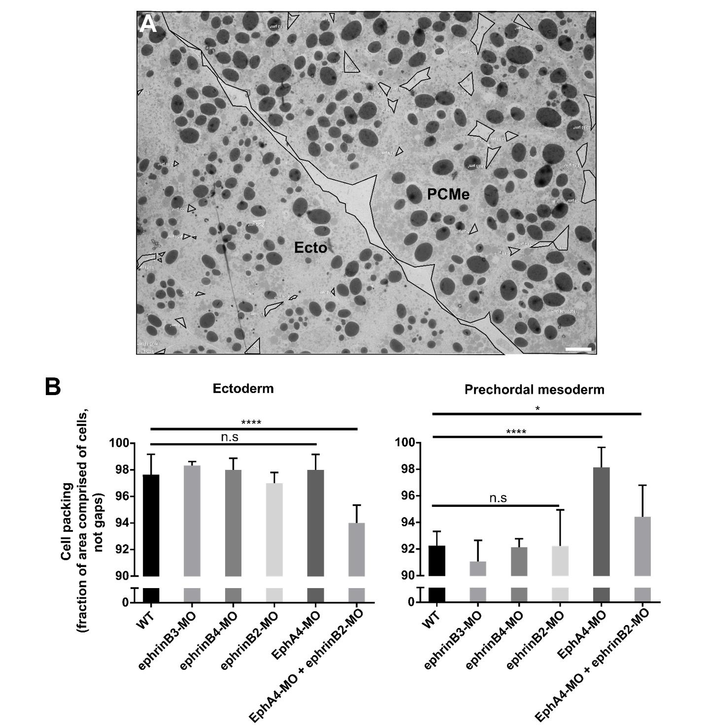 Figure S2. Cell packing in Eph/ephrin morphant Xenopus gastrula. (A) Outlined gap area vs. total area of boundary tissues. (B) Cell packing within ectoderm and prechordal mesoderm in Eph/ephrin morphants. Error bars represent standard deviation of the mean. One-way ANOVA was used to analyze variance. p>0.05 = n.s, p<0.05 = *, p<0.0001 = ****. Scalebar=10µm.