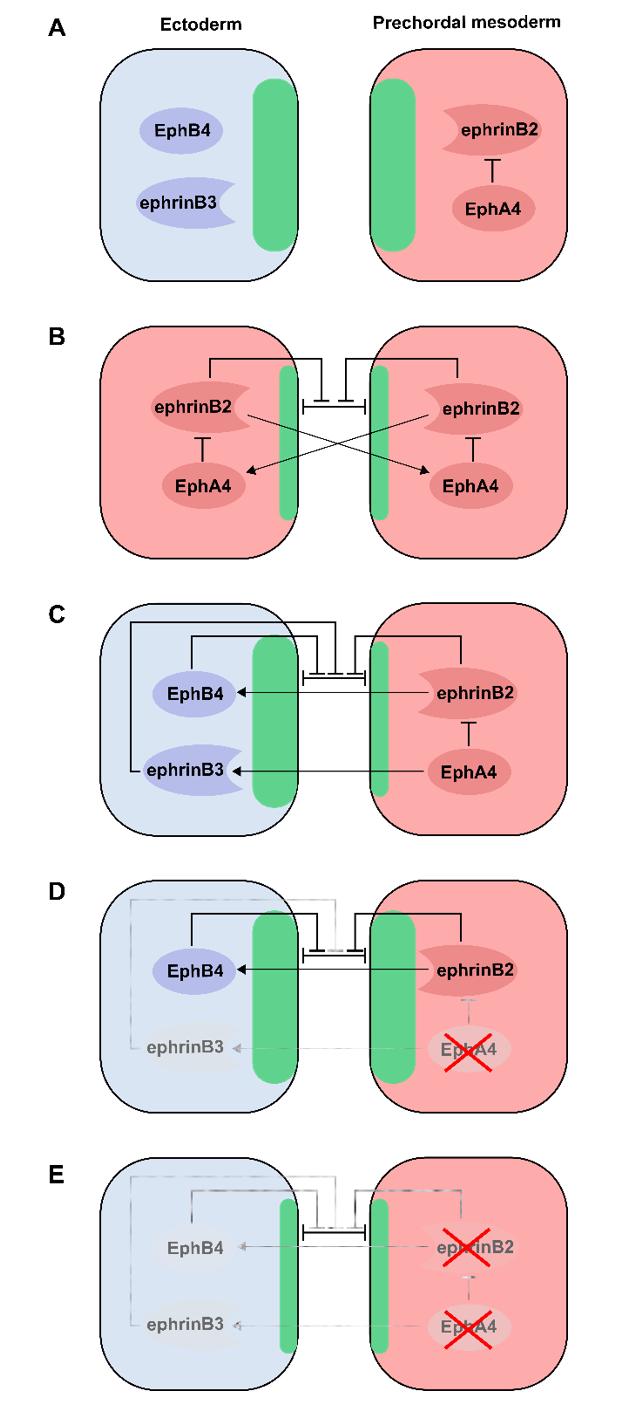 Figure S3. Modulation of contact-induced F-actin cortex downregulation by specific Ephs and ephrins. (A) Legend. Proposed Eph/ephrin signaling and its effects upon: (B) interactions between mesoderm cells, (C) interactions between ectoderm and mesoderm cells at Brachet’s cleft, (D) interactions at cleft in EphA4 morphants, and (E) upon knockdown of EphA4 and ephrinB2. The F-actin cortex is indicated in green, ectoderm in blue, and mesoderm in pink. Gray-shaded arrows and inhibitory lines indicate effects of respective Eph/ephrin knockdowns shown using red crossed lines.
