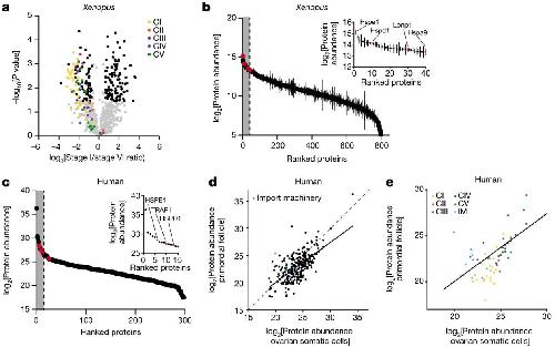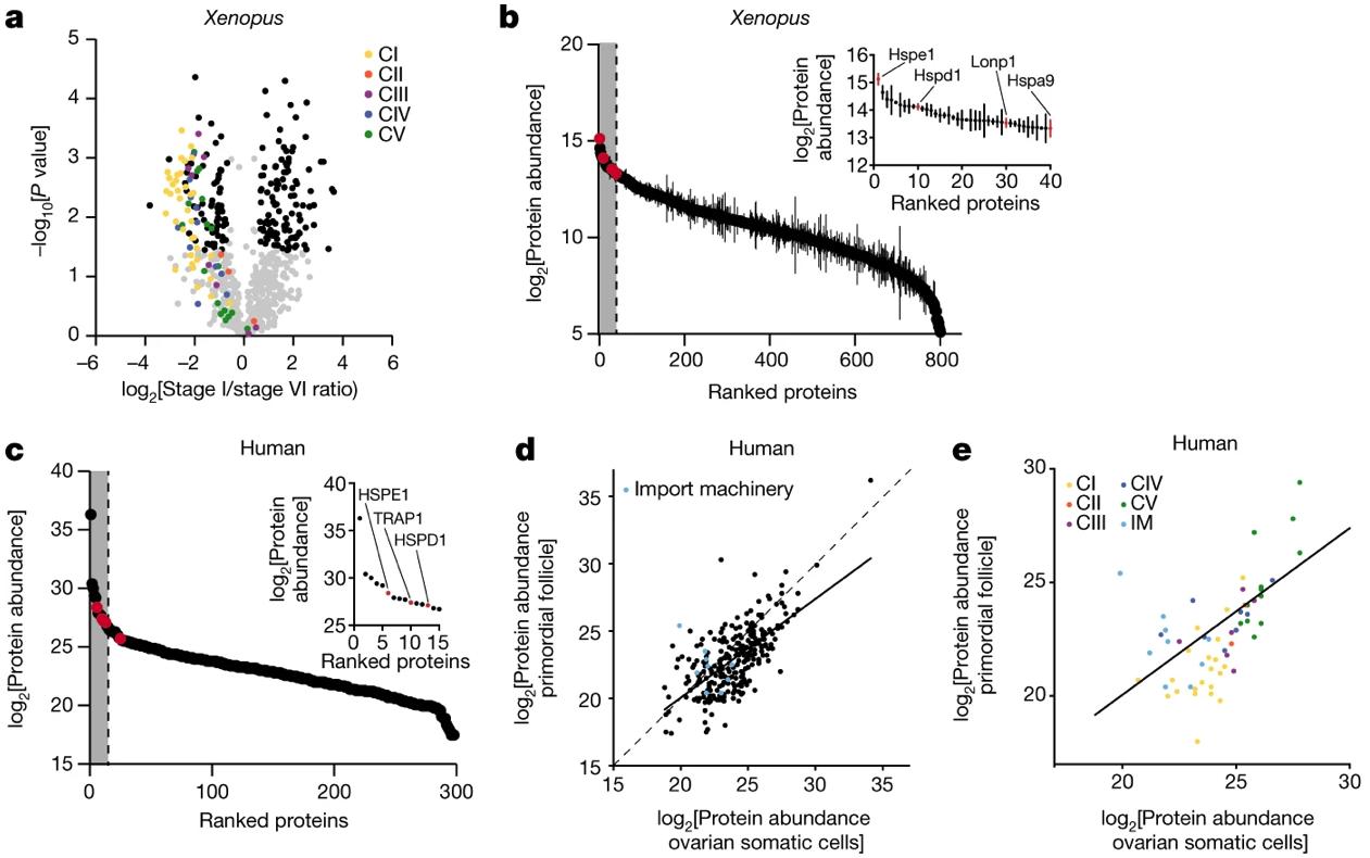 Fig. 3: The mitochondrial proteomes of Xenopus and human oocytes. a, A volcano plot showing P values versus fold changes of mitochondrial proteins between early (stage I) and late (stage VI) oocytes. The subunits of the mitochondrial OXPHOS machinery are indicated in colour, according to the key in the plot. Other mitochondrial proteins significantly changing (q valueâ<â0.05, >1.5-fold change) are depicted in black. nâ=â3 outbred animals, P values were calculated using two-sided Studentâs t-test, and q values were obtained by multiple-comparison adjustment. b, The early Xenopus oocyte proteome ranked by protein abundance. The inset shows data for the top 5% most abundant proteins, corresponding to the grey area of the graph. UPRmt proteins are indicated in red. The data are the meanâ±âs.e.m. from nâ=â3 outbred animals. c, The human primordial follicle proteome ranked by protein abundance. The inset shows data for the top 5% most abundant proteins, corresponding to the grey area of the graph. Oocytes were collected from ovaries of two patients and pooled together. UPRmt proteins are indicated in red. d,e, Scatter plots comparing mitochondrial (d) and OXPHOS (e) protein abundance in human primordial follicles and ovarian somatic cells. The dashed line represents the identity line xâ=ây and the solid line shows the linear regression estimate relating protein abundance between mitochondrial proteomes of primordial follicles and ovarian somatic cells. IM, import machinery. |