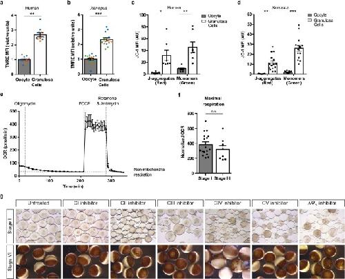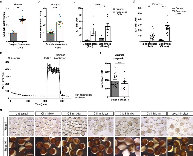 Extended Data Fig. 2. Oxidative phosphorylation is essential in early oocytes.a, b, Quantification of the mean fluorescence intensity (MFI) of TMRE in the oocyte and in the population of granulosa cells surrounding the equatorial plane of the oocyte for human (a) and Xenopus oocytes (b). The data represent the mean ± s.e.m. **P = 2.83 × 10−9 n=2 biological replicates in human; and ***P = 1.09 × 10−10 n=3 in Xenopus; using two-sided Student’s t-test. Replicates shown in colours. c, d, Quantification of the mean fluorescence intensity (MFI) of JC-1 aggregates (red) and monomers (green) in the oocyte and in the population of granulosa cells surrounding the equatorial plane of the oocyte for human (c) and Xenopus oocytes (d). We could not detect any red fluorescence in oocytes; an additional 2-hour incubation with JC-1 did not lead to detection of red fluorescence inside the oocyte either. The data represent the mean ± s.e.m. *P = 0.005 and **P = 0.002 in human, n=4; and **P = 5.67 × 10−6 and ***P = 4.42 × 10−9, n=3 in Xenopus; using two-sided Student’s t-test with Šidák-Bonferroni-adjusted P values for multiple comparisons. e, Oxygen consumption rate (OCR) as assessed by a seahorse analyser (XFe96) in early (stage I) Xenopus oocytes (mean ± SEM, n = 9). f, Maximal oxygen consumption rate in early (stage I) and growing (stage III) Xenopus oocytes, normalized for total protein/sample (n=17 for stage I and n=8 for stage III). The data represent the mean ± s.e.m. n.s. not significant (P = 0.299) using two-sided Student’s t-test. g, Representative images of Xenopus oocytes after an overnight treatment with mitochondrial poisons (5 µM Rotenone, 50 mM malonic acid, 5 µM antimycin A, 50 mM KCN, 200 µM DCCD or 30 µM CCCP). Upper panel shows early (stage I) oocytes and bottom panel displays late (stage VI) oocytes. Cell death can be recognized in early (stage I) oocytes by loss of plasma membrane integrity and/or loss of nucleus; and in late (stage VI) oocytes by development of a mottling pattern in the pigmentation of the animal pole (see main Fig. 2 for quantifications of three independent experiments). Scale bars: 250 µm and 1 mm for stage I and stage VI oocytes, respectively. Source data |