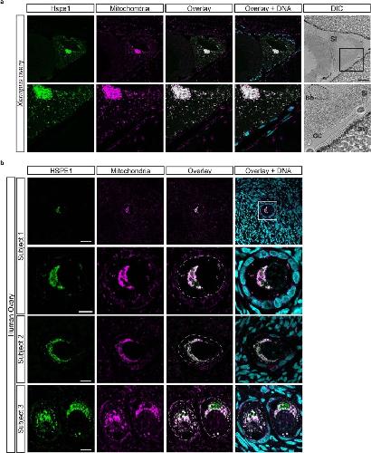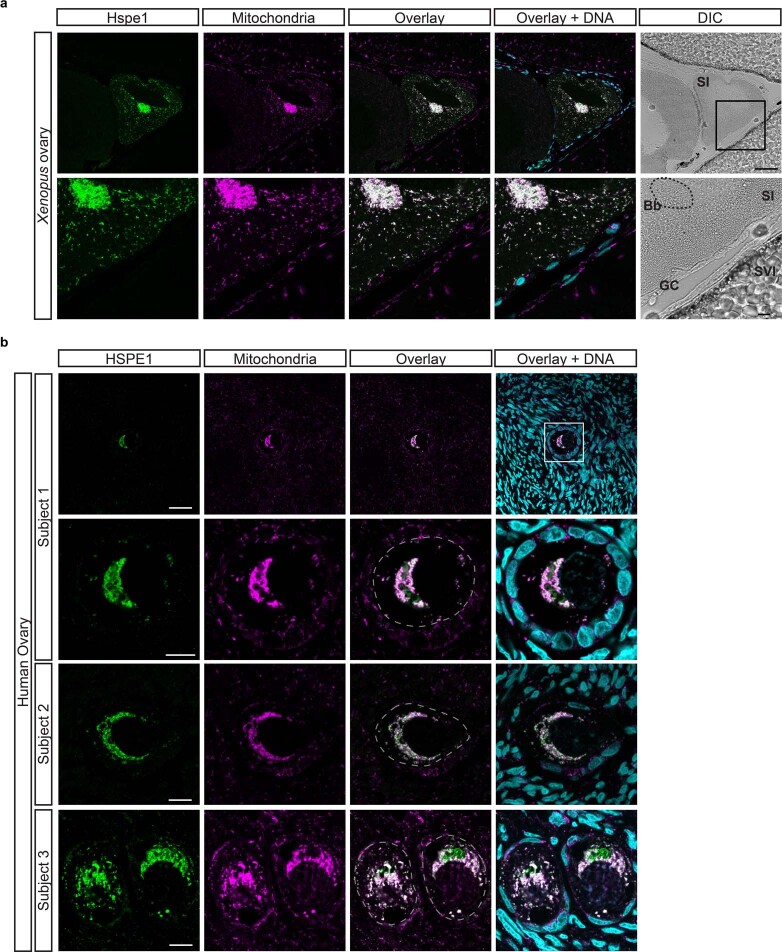 Extended Data Fig. 4. UPRmt is constitutively active in early oocytes of human and Xenopus.a, b, Immunofluorescence of paraffin embedded sections of Xenopus (a) and human (b) ovaries with antibodies against HSPE1 (to monitor UPRmt) and ATP5A1 (to mark mitochondria). Hoechst was used to mark DNA. ATP5A1 was detected both in oocytes and somatic cells of the ovary. HSPE1, on the other hand, was so abundant in oocytes compared to surrounding cells that no signal could be detected from somatic cells without oversaturating the HSPE1 signal from early oocytes. Representative images from three independent experiments are shown. SI: early (stage I) oocyte; SVI: late (stage VI) oocyte; GC: Granulosa cells; Bb: Balbiani body. DIC, differential interference contrast. Scale bars: 50 µm (upper panel) and 10 µm (lower panel) for Xenopus, and 30 µm (upper panel) and 10 µm (three lower panels) for human. |