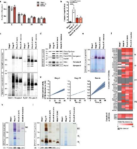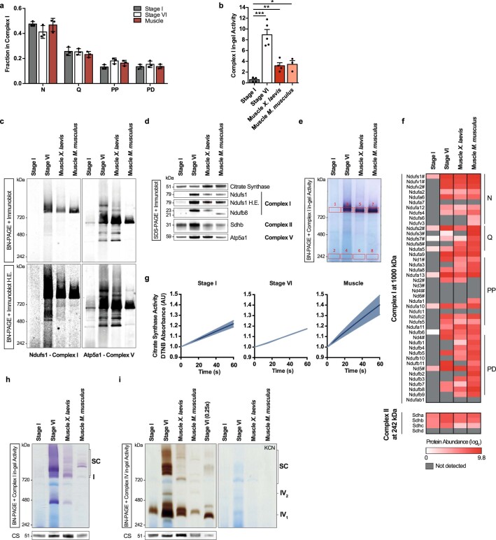 Extended Data Fig. 6. Complex I is not assembled in early oocytes.a, Fraction of the mean abundance of the indicated modules among all complex I modules in Xenopus oocytes and muscle tissue. Note that this analysis inevitably misses undetected subunits. The data represent the mean ± s.e.m. for n=3 animals. b, Quantification of reduced NBT intensity in BN-PAGE gels after complex I in-gel activity assays. The data represent the mean ± s.e.m. (n=5 for stage VI, n=4 for stage I and frog muscle, and n=3 for mouse muscle; biological replicates). *P = 0.0062, **P = 0.00046, and ***P = 1.44 × 10−4 using two-sided Student’s t-test with Šidák-Bonferroni-adjusted P values for multiple comparisons. c, DDM solubilized mitochondrial fractions were resolved by BN-PAGE followed by immunoblotting using antibodies against Ndufs1 and Atp5a1 to detect complexes I and V, respectively. Lower panels show high exposure (H.E.) blots. One representative immunoblot from three independent experiments is shown. d, SDS-PAGE and immunoblotting of mitochondrial fractions in (Fig. 4a) for complex I (Ndufs1 and Ndufb8), complex II (Sdhb) and complex V (Atp5a1) subunits, and citrate synthase as mitochondrial loading control. H.E. denotes high exposure. One representative immunoblot from three independent experiments is shown. e, Representation of excision sites for mass spectrometric identification of complex I and complex II subunits. f, Heatmap of protein abundances detected in bands excised from regions corresponding to assembled complex I, and complex II. Complex I subunits are organized by module, and # marks core subunits. Proteins that were not quantified are indicated in grey. g, Spectrophotometric analysis of citrate synthase activity in mitochondrial extracts from early (stage I), late (stage VI) oocytes and muscle. The data represent the mean ± s.e.m., n=3 biological replicates. h, i Digitonin solubilized mitochondrial fractions were resolved by BN-PAGE. Complex I (h) and complex IV (i) activities were assayed to detect supercomplexes (SC). Representative gels from three independent experiments are shown. Source data |