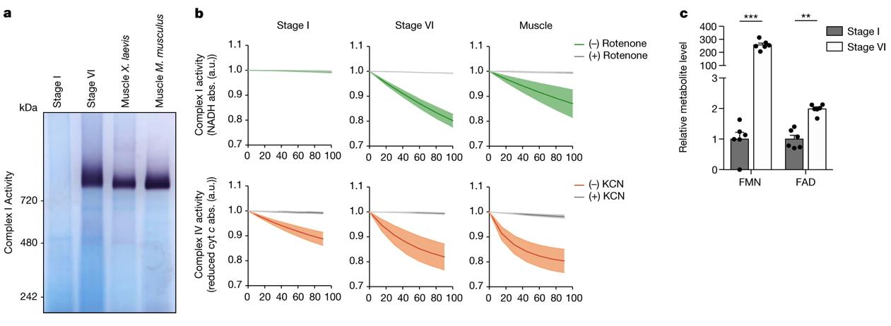 Fig. 4: Complex I is not assembled in early oocytes. a, Mitochondrial fractions solubilized in n-dodecyl-β-D-maltoside (DDM) were resolved by BN-PAGE and complex I activity was assayed by reduction of nitro blue tetrazolium chloride (NBT) in the presence of NADH. nââ¥â3 (see Extended Data Fig. 6b for quantifications). b, Spectrophotometric analysis of complex I (green, rotenone-specific activity) and complex IV (orange, KCN-specific activity) activities in mitochondrial extracts from early (stage I) and late (stage VI) oocytes and muscle. cytâc, cytochromeâc; abs, absorbance; a.u., arbitrary units. The data represent the meanâ±âs.e.m.; nâ=â3 biological replicates. c, Flavin mononucleotide (FMN) and flavin adenine dinucleotide (FAD) levels in early (stage I) and late (stage VI) Xenopus oocytes. The data represent the meanâ±âs.e.m.; nâ=â6. ***Pâ=â6.92âÃâ10â9 and **Pâ=â3.57âÃâ10â5 using two-sided Studentâs t-test with Å idákâBonferroni-adjusted P values for multiple comparisons. |