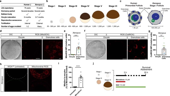 Extended Data Fig. 1. Undetectable levels of ROS in the early oocytes.a, A comparison between select reproductive traits of humans and Xenopus laevis, which live on average 76 years59 and 15 years in captivity60, respectively. Xenopus oocytes have long been used in reproduction studies61,62, in part because they are more accessible and share many conserved features with human oocytes, such as (1) a long dormancy period: Xenopus oocytes arrest at late-stage I for several years. Moreover, a large population of early oocytes is maintained in adult female ovaries throughout most of its life-time, suggesting the presence of an oocyte reserve similar to humans63–65. (2) A similar duration of the maturation period from early oocytes to mature eggs. (3) A measurable decline in fertility with age60,66,67. (4) A cytoplasmic distribution and activity of organelles similar to humans, including a Balbiani body found in the ooplasm of both species6,68,69. On the other hand, humans and Xenopus differ in their modes of fertilization: humans undergo internal fertilization, while Xenopus fertilization takes place externally. This important difference affects several features related to fertilization: Xenopus lay many eggs, each with considerable internal nutrient reserves for survival outside of the body, whereas humans ovulate only 1-2 eggs per cycle with little internal nutrient reserves70–72. b, A schematic of Xenopus laevis oogenesis according to42. Oogenesis in Xenopus is divided into six stages based on the morphology of the developing oocytes: oocytes are transparent and measure 50-300 microns in stage I. Oocytes grow and gradually accumulate pigments and yolk to become opaque and measure more than 1 mm in stage VI, when they are ready to be ovulated. c, Schematic representation of human and Xenopus early oocytes with attached granulosa cells. Nuclei (n) are depicted in blue and Balbiani bodies (Bb) in green. Note that Xenopus early oocytes are so large that their granulosa cells are visible only as small puncta on the periphery of the oocyte in the same magnification. d, f, Live-cell imaging of Xenopus early (stage I) oocytes with attached granulosa cells with MitoSOX (d), and CellROX (f) to detect their ROS levels. Granulosa cells were imaged in the basal plane of the oocyte. DIC, differential interference contrast. Scale bars: 50 µm and 10 µm for oocytes and granulosa cells, respectively. e, g, Quantification of MitoSOX (e) and CellROX (g) probes inside oocytes and in granulosa cells (n=3; biological replicates shown in colours). The data represent the mean ± s.e.m. ***P = 4.298 × 10−8 and **P = 1.86 × 10−5 using two-sided Student’s t-test. h, Live-cell imaging of ROS in early oocytes untreated or treated with menadione 10 µM for 2h. Untreated oocytes were incubated with Wheat Germ Agglutinin (WGA)488 (green) to mark the plasma membrane, then combined with treated oocytes in the same dish and labelled with MitoSOX. Scale bar: 50 µm. i, Quantification of MitoSOX in oocytes at the 4h timepoint (untreated or treated with 10 µM Menadione for 2h followed by 2h wash). The data represent the mean ± s.e.m, n=3 biological replicates, at least 3 oocytes were quantified per replicate ****P = 2.21 × 10−9 using two-sided Student’s t-test. j, Experimental design for the assessment of survival upon mild ROS production. Freshly isolated early (stage I), maturing (stage II and III), and late-stage (stage VI) oocytes of were treated with 10 µM menadione in the presence or in the absence of 10 mM N-acetyl cysteine (NAC). After 2h, menadione was removed and NAC was maintained for an overnight, when survival was determined. Source data |