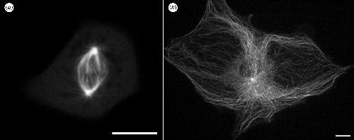 Figure 6. Cells stably expressing EGFP-tubulin imaged with spinning disc confocal microscopy. (a) XTN-6 cell in mitosis. Image depicts cell at metaphase captured from a time lapse video recording which is shown in electronic supplementary material, video S1. (b) A large XTN-8 cell in interphase. Image depicts a flattened z projection of a live cell. Bars = 10 µm.
