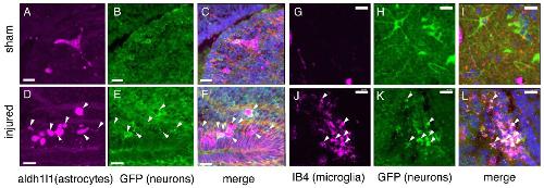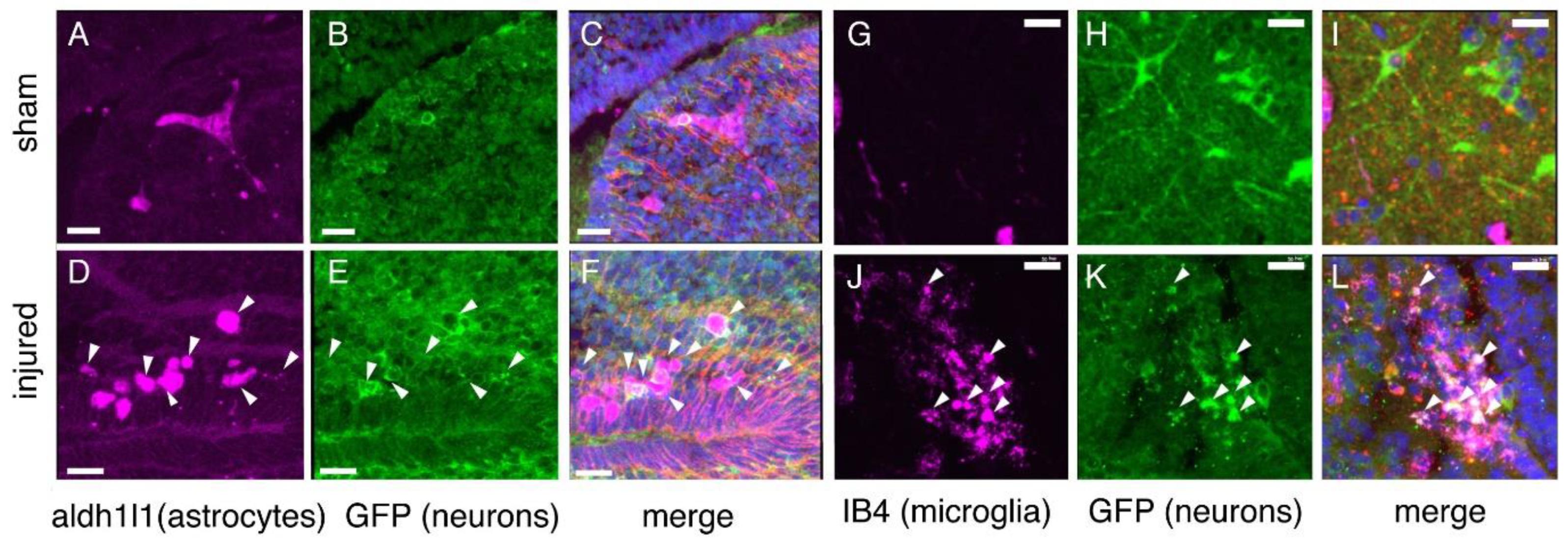 Figure 5. Evidence of phagocytic astrocytes and microglia following injury. Injured midbrains 24 h post-injury include both astrocytes (DâF) and microglia (JâL) that are positive for N-tubulin-GFP (white arrowheads), as well as for aldh1l1 (astrocytes) or IB4 (microglia); merged fluorescent signal appears white. Magenta (AâF), aldh1l1; Magenta 9 (GâL), IB4; Green, N-Tubulin-GFP; Blue, DAPI. Sham brains (AâC,GâI) contain no more than a few such cells. scale bars, 20 µm.