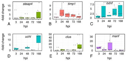 Figure 7. Expression of genes associated with astrocyte reactivity and neuroprotection. Quantitative RT-PCR assays for expression of the âreactive astrocyteâ-associated genes steap4 (A), and timp1 (B), as well as the neuroprotective genes brain-derived neurotrophic factor (bdnf) (C), ubiquitin C-terminal hydrolase-1 (uchl) (D), clusterin (clus) (E), and mesencephalic astrocyte-derived neurotrophic factor (manf) (F). RNA was isolated from sham and injured midbrains at the intervals shown; injured values are normalized to sham-treated controls. Plots show individual data points and a box showing the mean and 95% confidence intervals. n ⥠6 experiments.