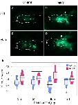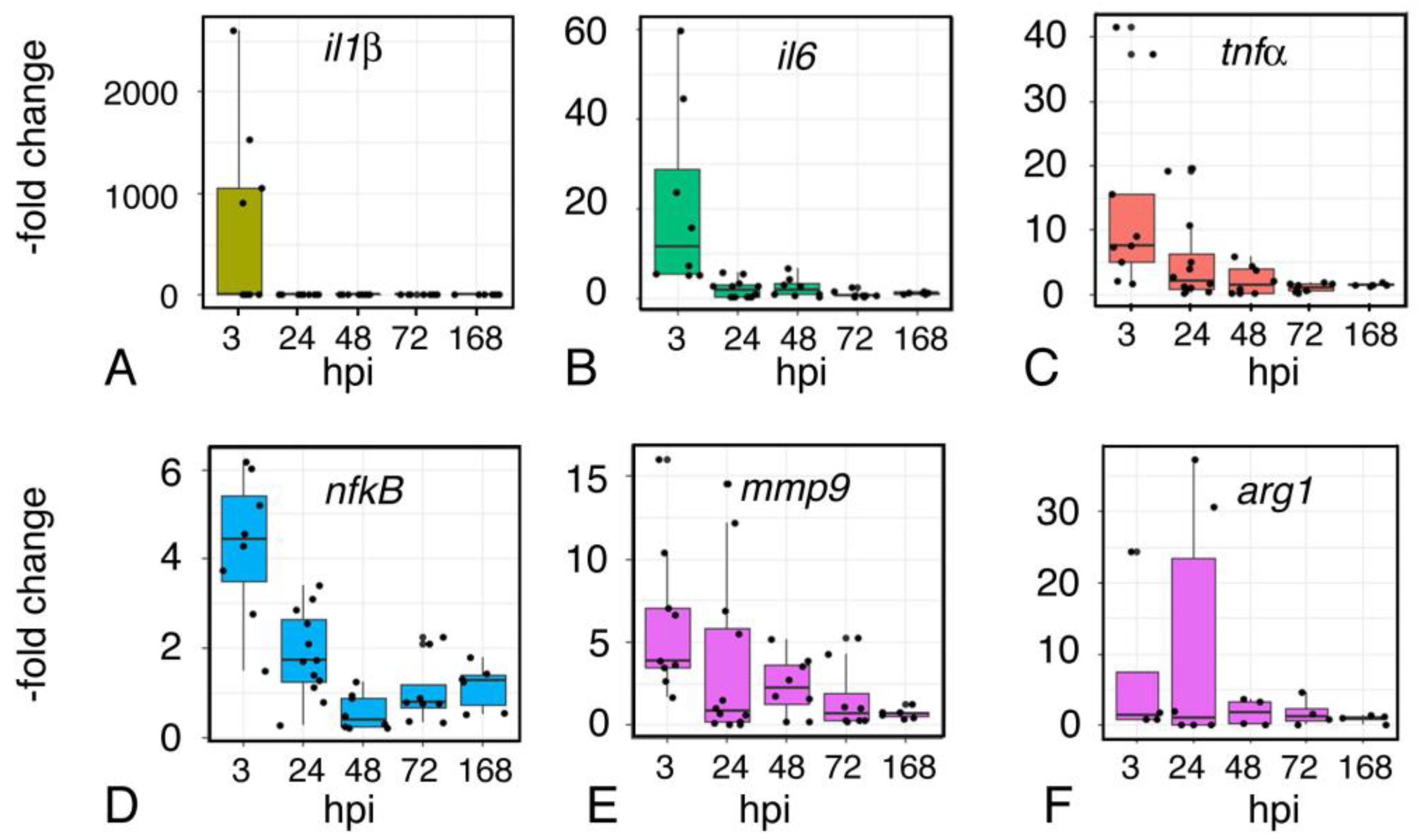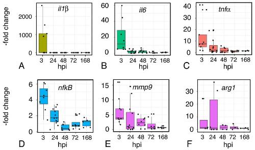 Figure 9. Time course of expression of inflammation-associated genes following injury. Quantitative RT-PCR assays for expression of the inflammatory cytokines Interleukin1-β (il1β) (A), Interleukin6 (il6) (B), Tumor Necrosis Factor-α (tnf-α) (C), as well as Nuclear Factor kB (nfkB) (D), matrix metalloproteinase 9 (mmp9) (E), and arginase (arg) (F). RNA was isolated from sham and injured midbrains at the intervals shown; injured values are normalized to sham-treated controls. Plots show individual data points and a box showing the mean and 95% confidence intervals. N ≥ 4 experiments.
