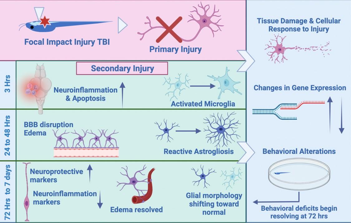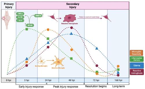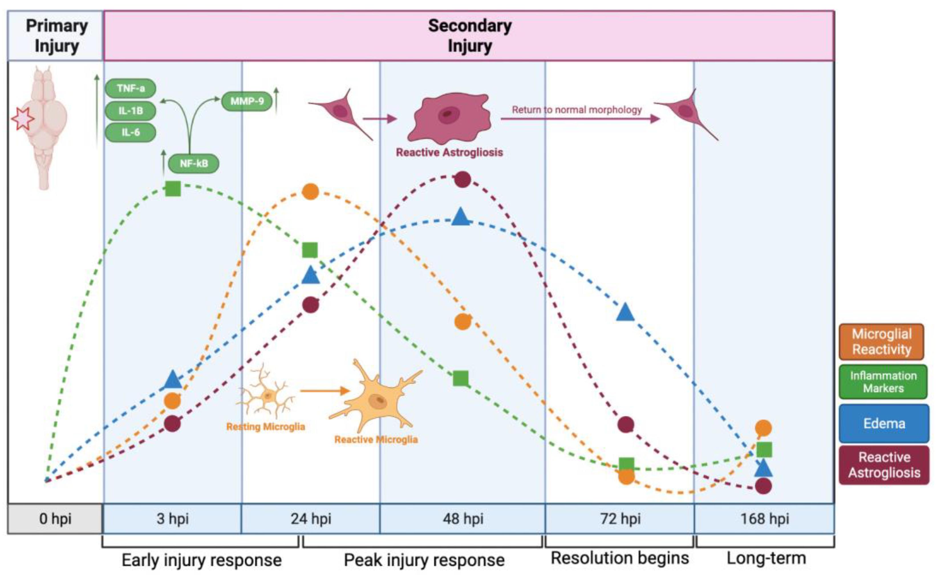 Figure 10. A timeline of response to focal impact injury. The response to focal impact injury begins with the release of inflammatory cytokines, followed by microglial activity, astrocyte reactivity, and edema. Within 48 h, each of these activities has peaked, and all have subsided to near-baseline levels after one week (This image was made using BioRender (Suite 200, Toronto, ON, M5V 2J1)).