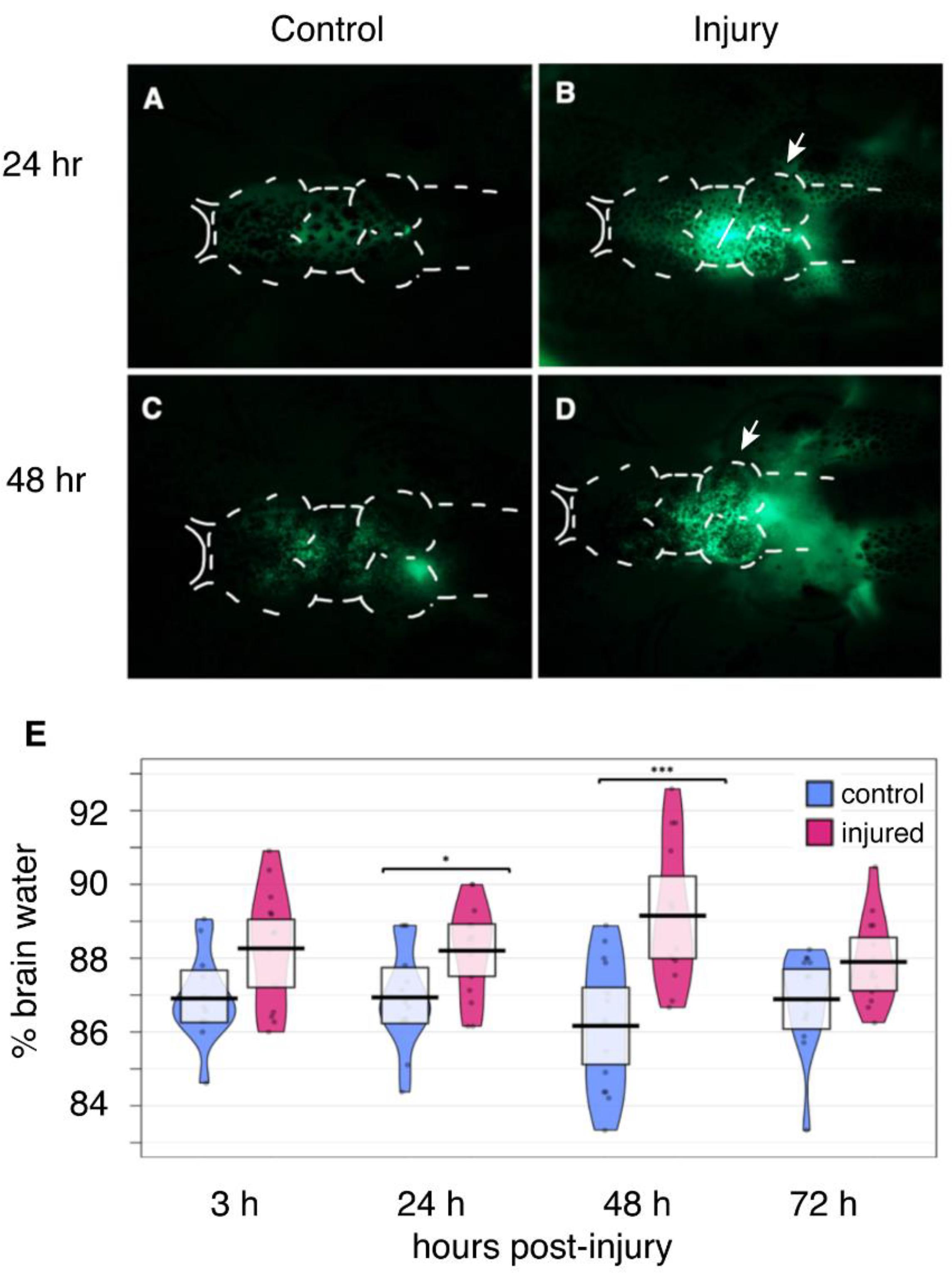 Figure 1. Focal Impact Injury leads to Edema and Disruption of BBB integrity. Sham tadpoles were anesthetized and transferred temporarily to the injury cradle prior to intraventricular injection with sodium fluorescein (NaF) either 24 h post-injury (h.p.i.) (A) or 48 h.p.i (C). Injured animals were anesthetized and then subjected to focal impact injury at the optic tectum (white arrows). Following either 24 h (B) or 48 h (D) of recovery post-injury, tadpoles were given an intraventricular injection with 10 nL of 1âμg/mL NaF; diffusion of the tracer was visualized using fluorescence microscopy. Arrows in (B,D) show the site of injury. (AâC) White dotted lines indicate the outer borders of the brain. Images are representative of n = 6 animals per treatment group for each time point. (E) * p < 0.05; *** p < 0.001.
