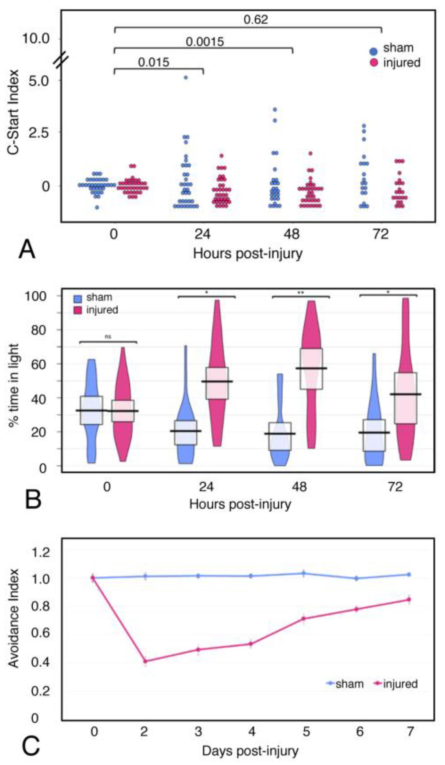 Figure 2. Focal impact injury causes deficits in visually mediated behaviors. NF stage 55 Xenopus laevis tadpoles were evaluated for baseline behavior at 0 h.p.i. in each behavioral assay, then a focal impact injury was administered to the optic tectum (OT) of each animal in the injured group (pink). Sham animals (blue) were anesthetized and moved in and out of the injury cradle after Day 0. (A) Open field testing, C-Start reflex. Open field tests were performed once per day up to 72 h.p.i. following a 0 hpi baseline. The number of C-Start reflexes performed in the injured group was significantly reduced at 24 and 48 h.p.i. (B) Light/Dark box assay. Open field tests were performed once per day up to 72 h.p.i. following a 0 hpi baseline. Light zone time was significantly increased in injured animals at all three timepoints. (C) Visual avoidance behavioral assay. Baseline data were collected at 0 h.p.i., then the injury or sham injury was administered. The test was performed daily to assess the recovery of the visual avoidance behavior. Beginning 48 h.p.i., injured tadpoles display a significant deficit in the avoidance behavior, which they appear to recover over a time course of 7 d.p.i. [Significant p-values from two-way analysis of variance (ANOVA) are shown as * pâ < â0.05, ** pâ < â0.01, n.s. indicates no significant difference].