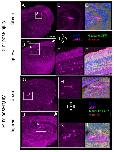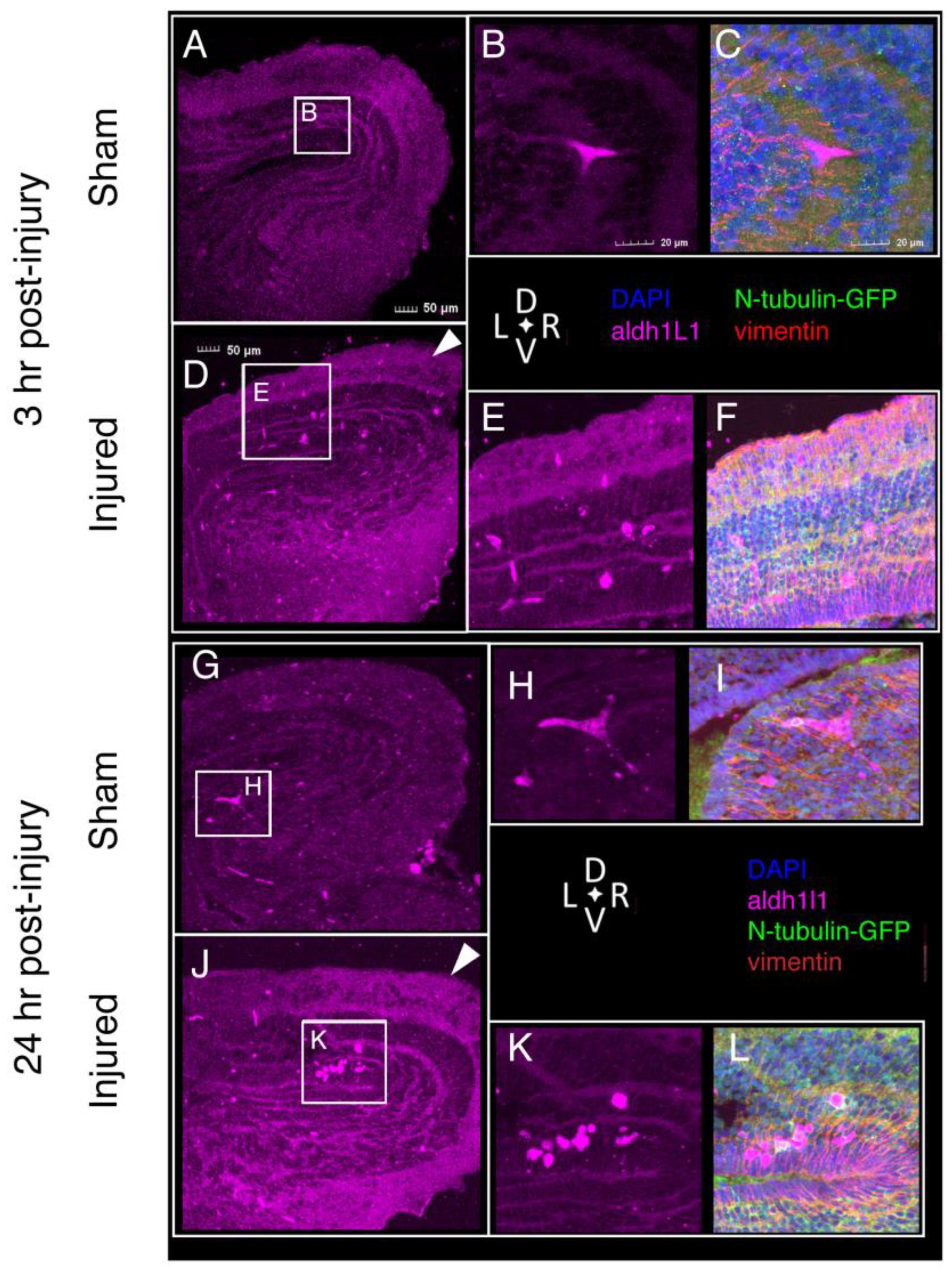 Figure 3. Astrocytes visualized with antibodies against Aldh1L1 via immunofluorescence microscopy. Sections from NF stage 55 N-tubulin-GFP+ Xenopus laevis midbrains of both sham (AâC) and injured (DâF) animals at 3 h post-injury show astrocytes (aldh1L1-positive) in the dorsolateral midbrain and optic tectum (OT). Astrocytes in midbrains 3 h after injury show differences in morphology (B vs. E) and distribution (A vs. D); these differences persist at 24 h post-injury. (GâI), sham; (JâL), injured. (For all images, Alexa Fluor 647 signal was digitally converted to magenta. Sections were also processed to visualize neurons (anti-GFP, green), nuclei (DAPI, blue), and intermediate filaments (anti-Vimentin, red). Sections are 14 µm thick and images selected are representative of all samples examined (n = 6 brains).