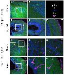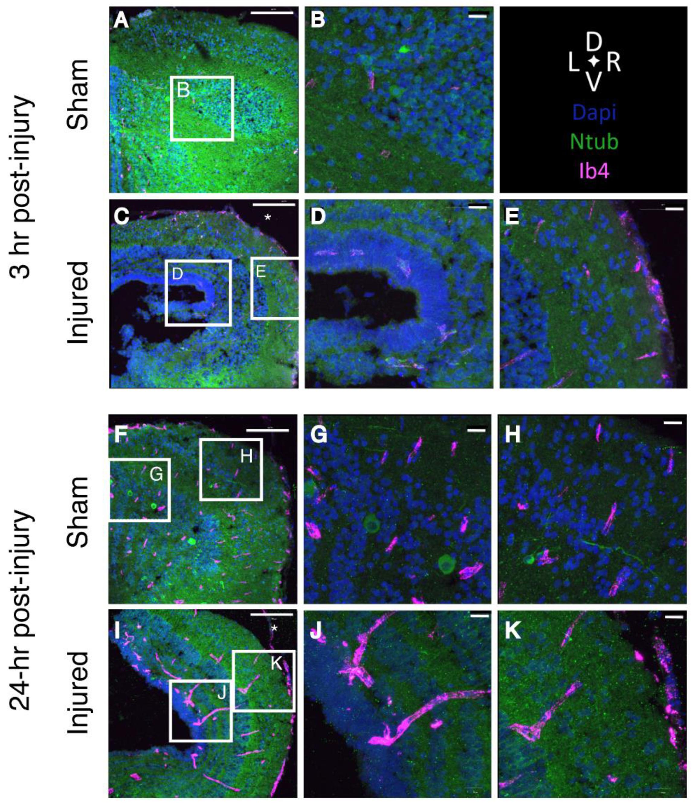 Figure 4. Microglia localize around the ventricle of the injured midbrain. Confocal images of midbrains 3 h after injury; midbrains were isolated from N-tubulin-GFP tadpoles (neurons, green) injected with Ib4-Alexa 647 to label microglia (magenta). Brain were sectioned at 15 µm; nuclei are labeled with DAPI (blue). (A,B) Sham-treated midbrain. (CâE) Midbrain 3 h after injury. (E) Microglia accumulate near the site of injury. (A,C): Scale bar 100 µm. (B,D,E): Scale bar 20 µm. Scale 100 µm. (FâK), confocal images of St. 55 midbrains after 24 h. In the sham brain, microglia are visible both close to the ventricle (G) and toward the periphery of the neuropil (H). In the injured midbrain, microglia form clusters both near the ventricles (J) and in the neuropil near the site of injury (K). (F,I): Scale bar 100 µm. (G,H,J,K): Scale bar 20 µm. Asterisks in (C,I) mark the site of injury (n = 3). * indicates the site of administration for the focal impact injury.