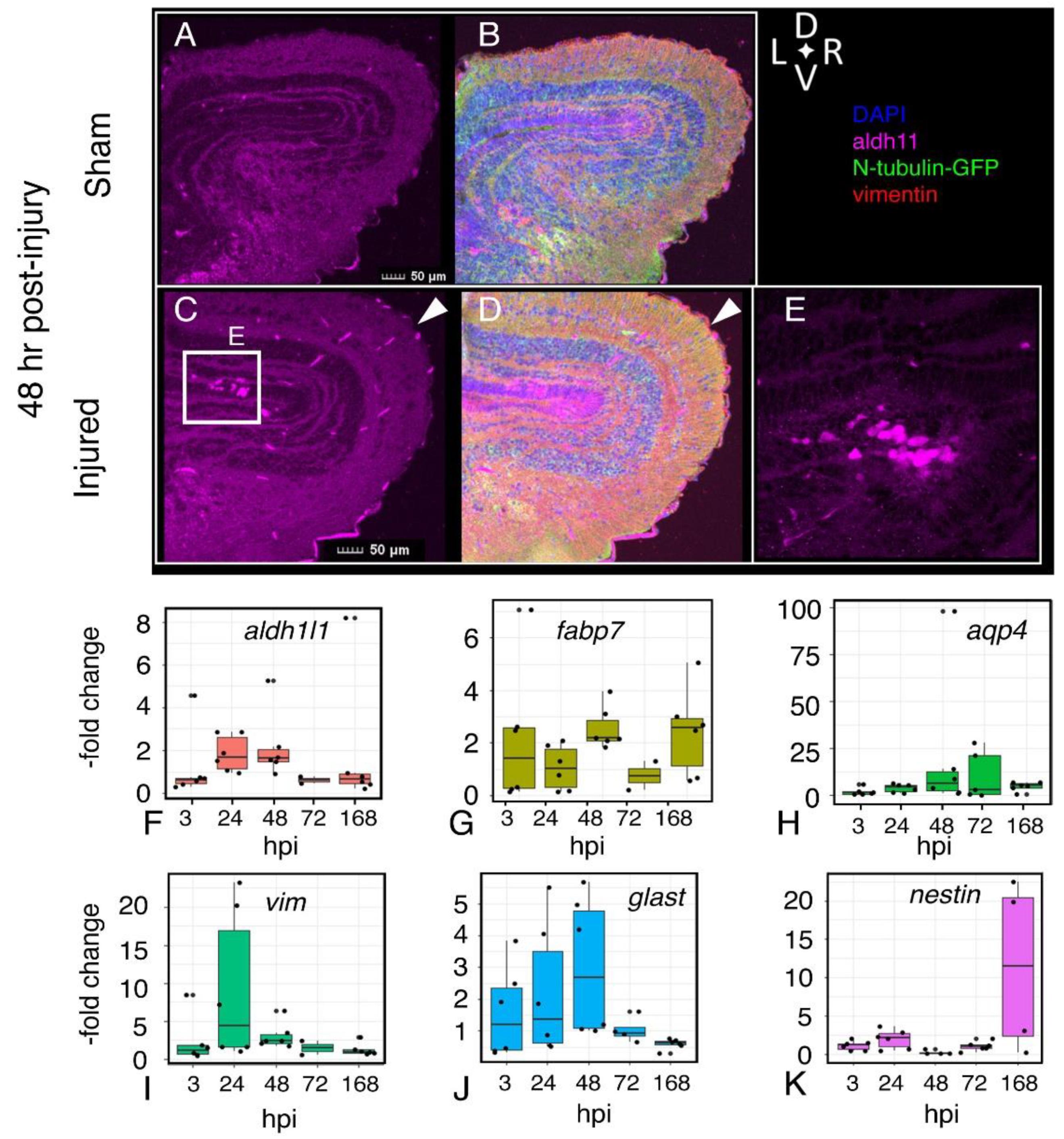 Figure 6. Persistence of altered astrocyte morphology and expression of astroglial genes following injury. Visualization of astrocytes (aldh1l1-positive cells, magenta), neurons (N-tubulin-GFP), radial glia (vimentin-positive, red) in sham (A,B) and injured (CâE) 48 h after injury. Amoeboid astrocytes accumulate near the ventricular layer (C,E). Quantitative RT-PCR assays for expression of astroglia-associated genes Aldehyde dehydrogenase 1 family member 1 (aldh1l1) (F), fatty acid-binding protein 7 (fabp7) (G), aquaporin4 (aqp4) (H), vimentin (vim) (I), excitatory amino acid transporter 1 (glast) (J), and nestin (nes) (K). RNA was isolated from sham and injured midbrains at the intervals shown; injured values are normalized to sham-treated controls. Plots show individual data points and a box showing the mean and 95% confidence intervals. n ⥠6 experiments.
