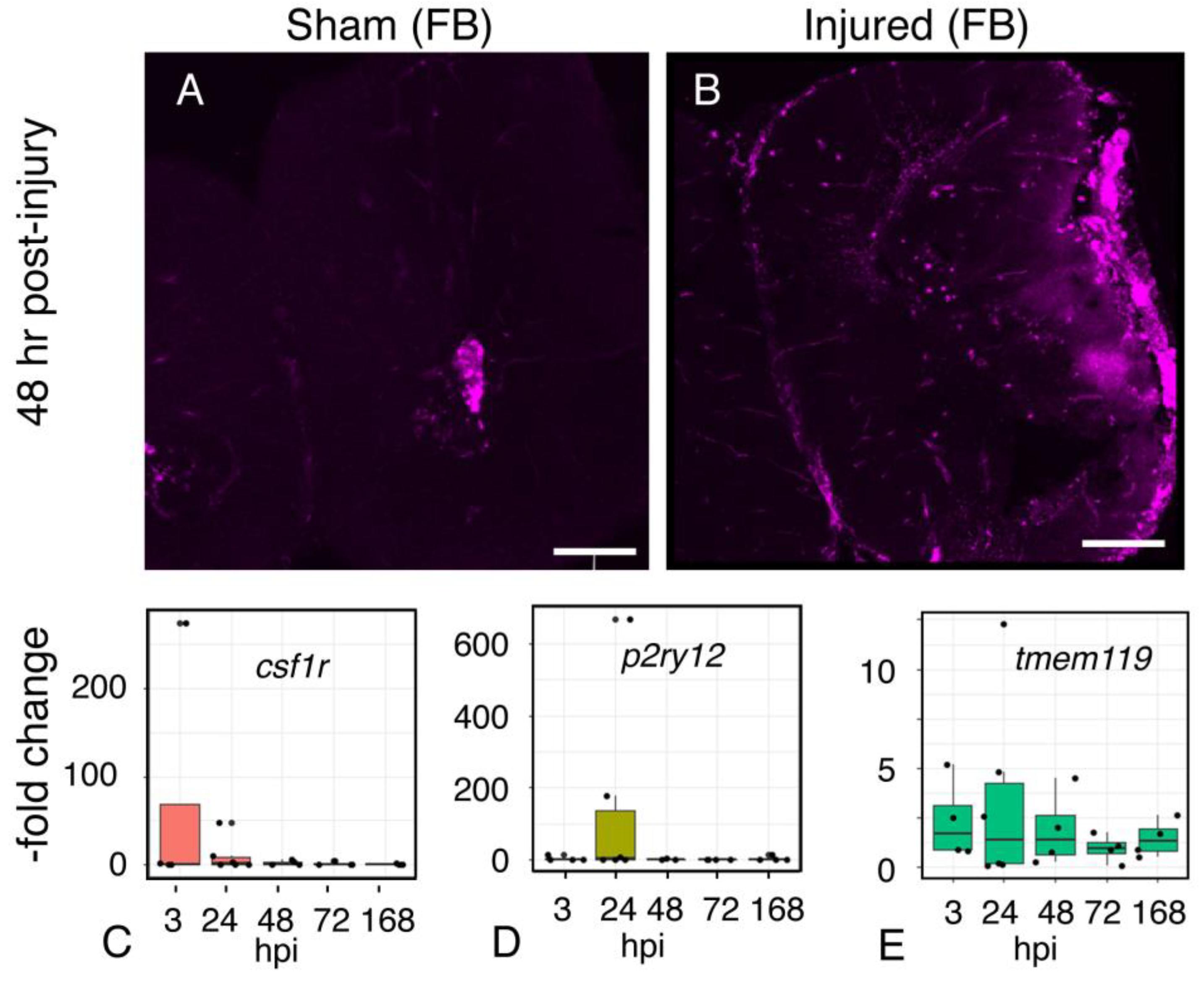 Figure 8. The microglial response to midbrain injury extends to the forebrain. Confocal images of microglia (IB4-positive cells) in sham (A) and injured (B) forebrains 48 h after injury. Microglia accumulate within the ipsilateral forebrain, at a distance from the injury site at the optic tectum (not pictured). The images are characteristic representations of all samples (n = 3). Brain sections are 50 µm thick. Scale 100 µm. (CâE), Time course of expression of microglia-associated genes following focal impact injury. RNA was isolated from sham and injured midbrains at the intervals shown; injured values are normalized to sham-treated controls. Plots show individual data points and a box showing the mean and 95% confidence intervals. N ⥠4 experiments.