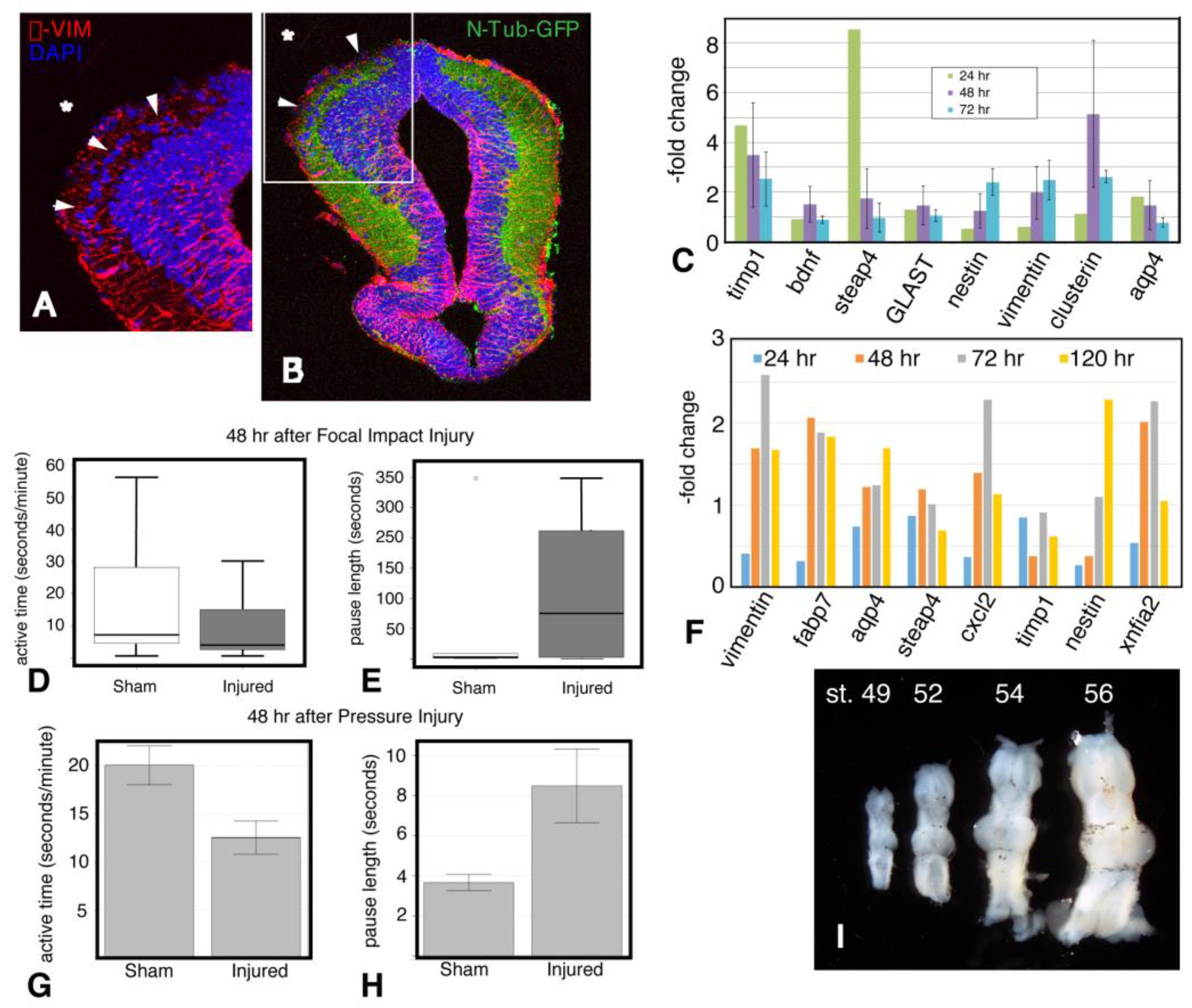 Figure A1. Initial comparisons of focal impact and pressure injury. Midbrain of a st. 48 N-tubulin-GFP tadpole 72 h after focal impact injury. Asterisks mark injured side. (A) Enlarged image of injury site; arrowheads indicate cells that have migrated into the injury area. (B) Entire section shows differences between injured and uninjured sides. Arrowheads show loss of axonal material at the injury site. Red, anti-vimentin (astrocytes and radial glia); Blue, DAPI (nuclei); Green, N-Tubulin-GFP (axons). (C) Quantitative RT-PCR of gene expression in brains from tadpoles subjected to focal impact injury shows expression profile of selected genes at 24, 48, and 72 h post-injury. Genes include markers of reactive astrocytes (timp1, steap4), astrocytes (GLAST, aqp4), radial glia (nestin), and neuroprotective genes (bdnf, clusterin). Open field assays show behavioral alterations in response to focal impact injury (D,E). (D) Comparison of active time in sham vs. injured tadpoles measured during a 10-min interval. Tadpoles were not prescreened for baseline activity. N ⥠10 tadpoles/ sample. (E) Comparison of pause duration in sham vs. injured tadpoles from the same recordings. N ⥠10 tadpoles/sample. (F) Quantitative RT-PCR of gene expression in brains subjected to pressure injury at 24, 48, 72, and 120 h post-injury. Genes include markers of astrocytes (vimentin, fabp7, aqp4, xfia2), reactive astrocytes (timp1, steap4), inflammation (cxcl2), and radial glia (nestin). Open Field assays of tadpoles subjected to pressure injury (G,H). (G) Comparison of active time in sham vs. pressure-injured tadpoles measured during a 10-min interval. Again, tadpoles were not prescreened for baseline activity. N = 50 tadpoles/sample. (H) Comparison of pause duration in sham vs. pressure-injured tadpoles from the same recordings. N = 50 tadpoles/sample. (I) Dramatic growth in brain size during the first half of metamorphosis (st. 48â56).