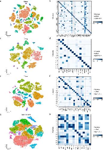 t-SNE map of Xenopus brain (a), lung (c), liver (e), and bone marrow (g) single-cell data. Cells are colored by cell-type cluster; Heatmap showing representative gene expression in each cluster of Xenopus brain (b), lung (d), liver (f), and bone marrow (h). The color encodes the average expression level.