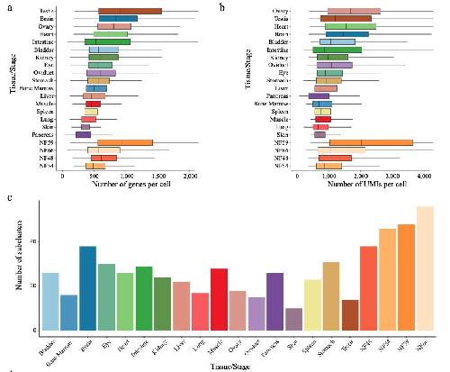 Supplementary Figure 1. [abc panels] Details of XCL construction. a, Number of genes per cell detected for each tissue/stage in the XCL. b, Number of UMIs per cell detected for each tissue/stage in the XCL. c, Number of subclusters detected for each tissue/stage in the XCL. d, Heatmap showing representative gene expression in each cell cluster in the XCL.