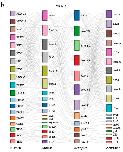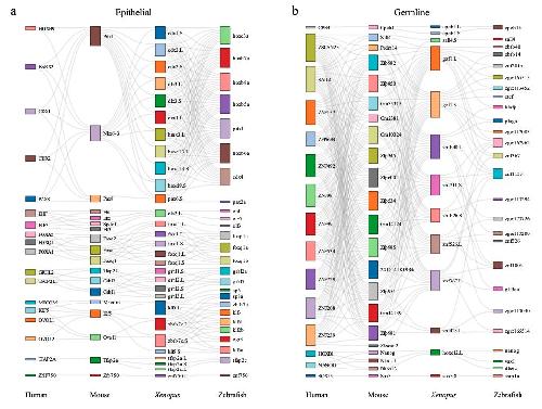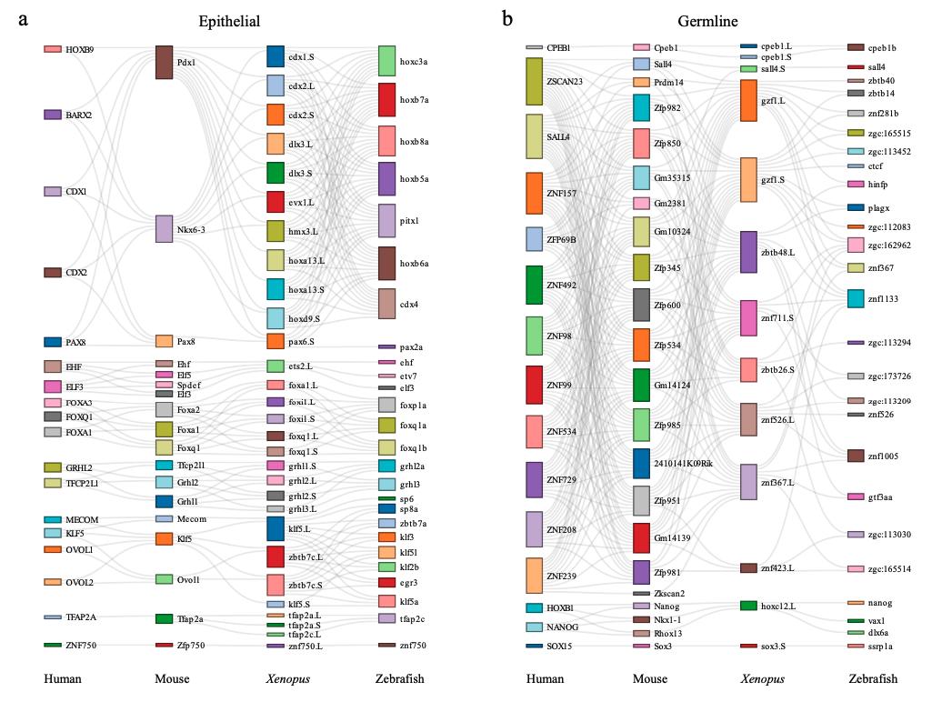 Supplementary Figure S7. [panel a Epithelial and b germline] The common lineage-specific TFs for each lineage. Sankey plot showing common lineage-specific TFs in epithelial (a), germline (b), erythrocyte (c) and immune (d). Different TFs in each species are marked in different color boxes. Homologous TFs between species obtained from SAMap are connected by lines.