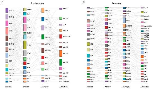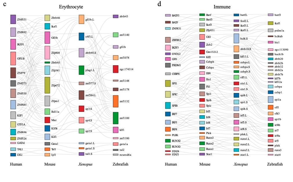 Supplementary Figure S7. [panel b Erythrocyte and d Immune] The common lineage-specific TFs for each lineage. Sankey plot showing common lineage-specific TFs in epithelial (a), germline (b), erythrocyte (c) and immune (d). Different TFs in each species are marked in different color boxes. Homologous TFs between species obtained from SAMap are connected by lines.