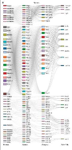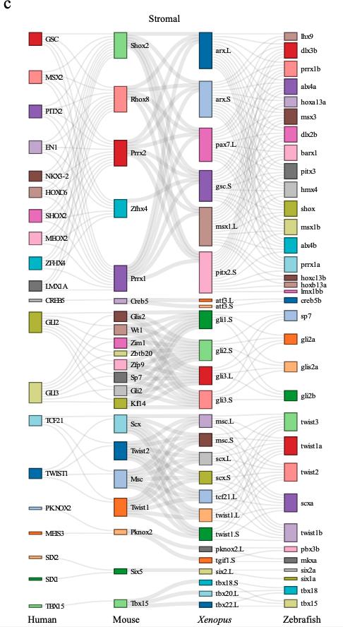Supplementary Figure 8.[panel c stromal] The common lineage-specific TFs for each lineage. Sankey plot showing common lineage-specific TFs in neuron (a), muscle (b) and stromal (c). Different TFs in each species are marked in different color boxes. Homologous TFs between species obtained from SAMap are connected by lines.