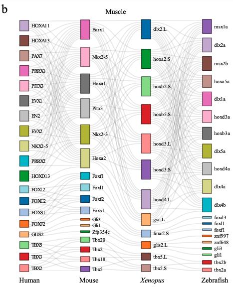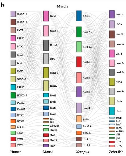 Supplementary Figure 8. [panel b muscle] The common lineage-specific TFs for each lineage. Sankey plot showing common lineage-specific TFs in neuron (a), muscle (b) and stromal (c). Different TFs in each species are marked in different color boxes. Homologous TFs between species obtained from SAMap are connected by lines.