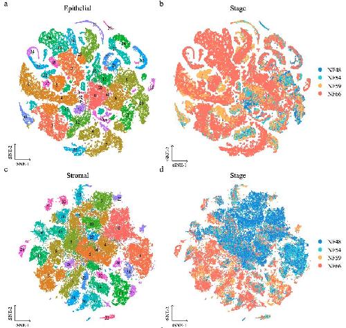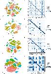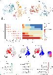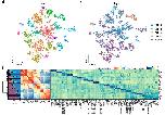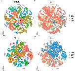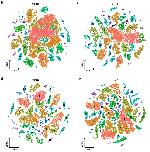 Supplementary Figure 10. [ panels a b] Cellular heterogeneity of larval Xenopus cell lineages. t-SNE maps of single-cell data from larval epithelial (a), stromal (c) and immune (e) during metamorphosis. Cells are colored by cell-type cluster; t-SNE maps of single-cell data from larval epithelial (b), stromal (d) and immune (f) during metamorphosis. Cells are colored by stage.