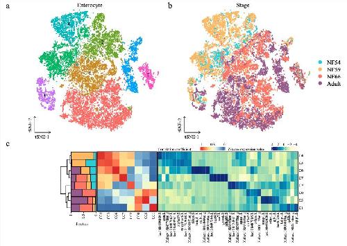 Supplementary Figure 11. [panels d e f] The correlation between larval and adult cell types. t-SNE maps of single-cell data from larval and adult enterocytes (a) and stomach parietal cells (d). Cells are colored by cell-type cluster; t-SNE maps of single-cell data from larval and adult enterocytes (b) and stomach parietal cells (e). Cells are colored by stage. Heatmap showing representative gene expression and correlation of larval and adult enterocytes (c) and stomach parietal cells (f). AUROC scores were used to measure the similarity of cell types: red, high correlation; blue and yellow, low correlation, based on the Spearman correlation. The stacked bar plots illustrate the proportion of clusters. Stage is marked by different colors same as b and d, respectively.